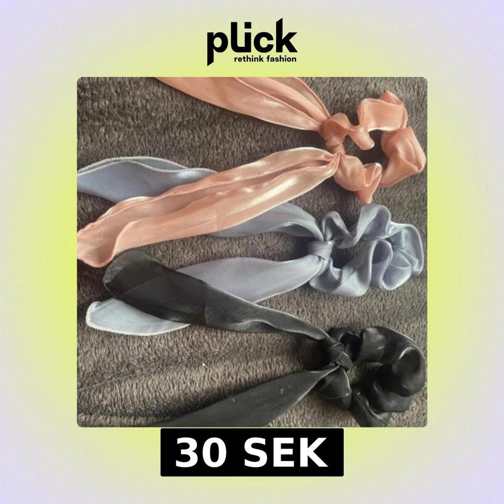 Tre snygga scrunchies i glansigt tyg med lĂ„nga band, perfekta för att piffa upp din frisyr. En i ljusrosa, en i ljusblĂ„ och en i svart. Ger en trendig och feminin look till hĂ„ret. 30kr styck eller 80kr för allađ«¶đ»