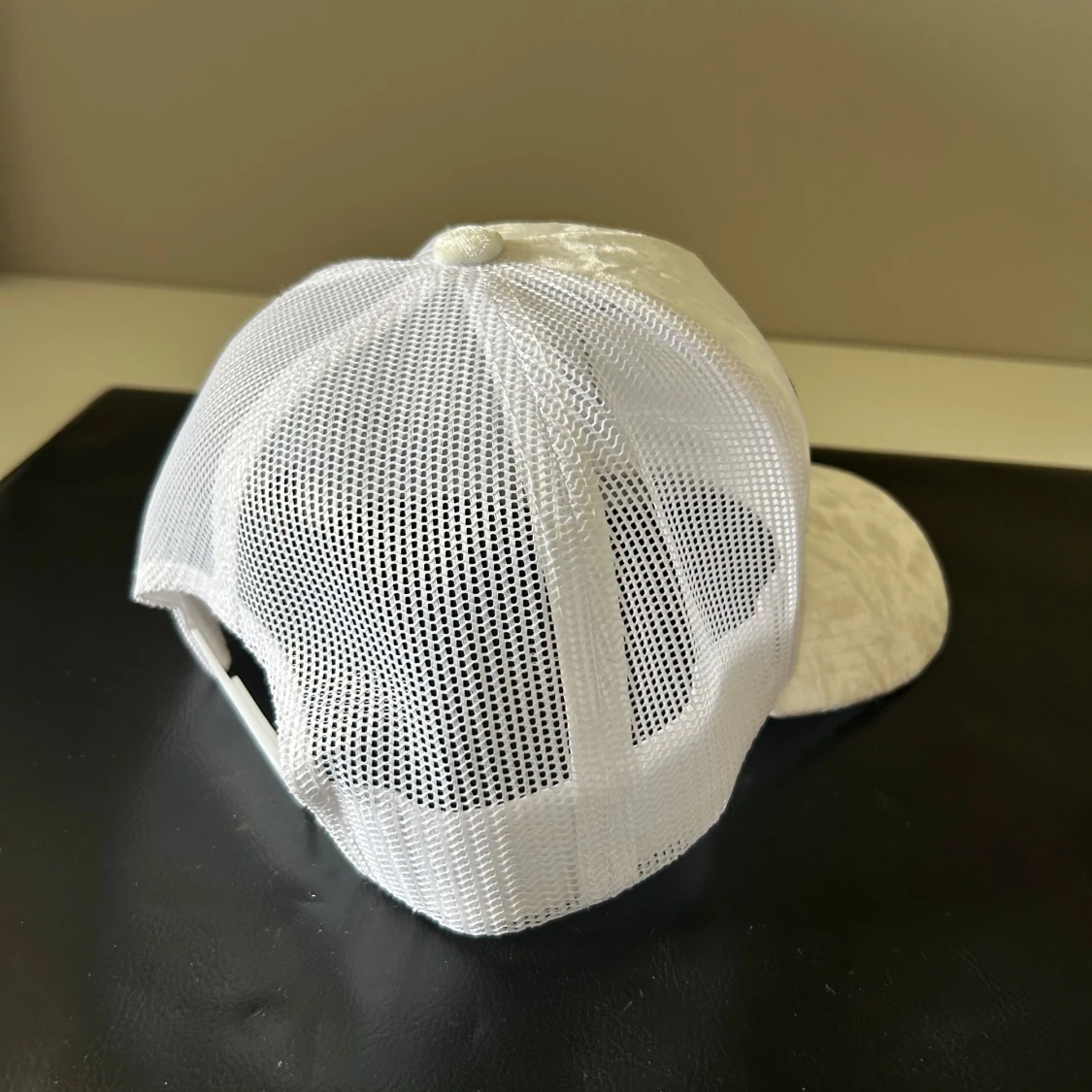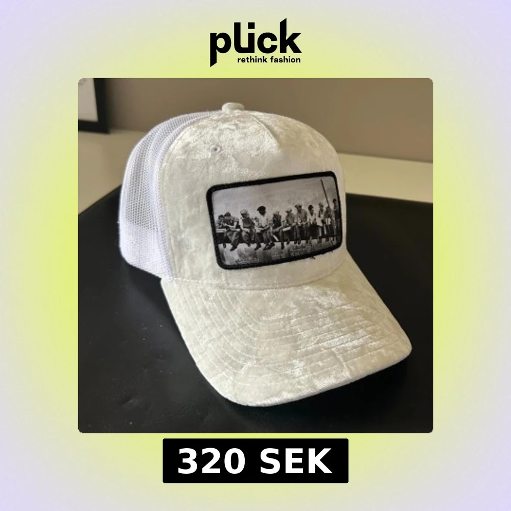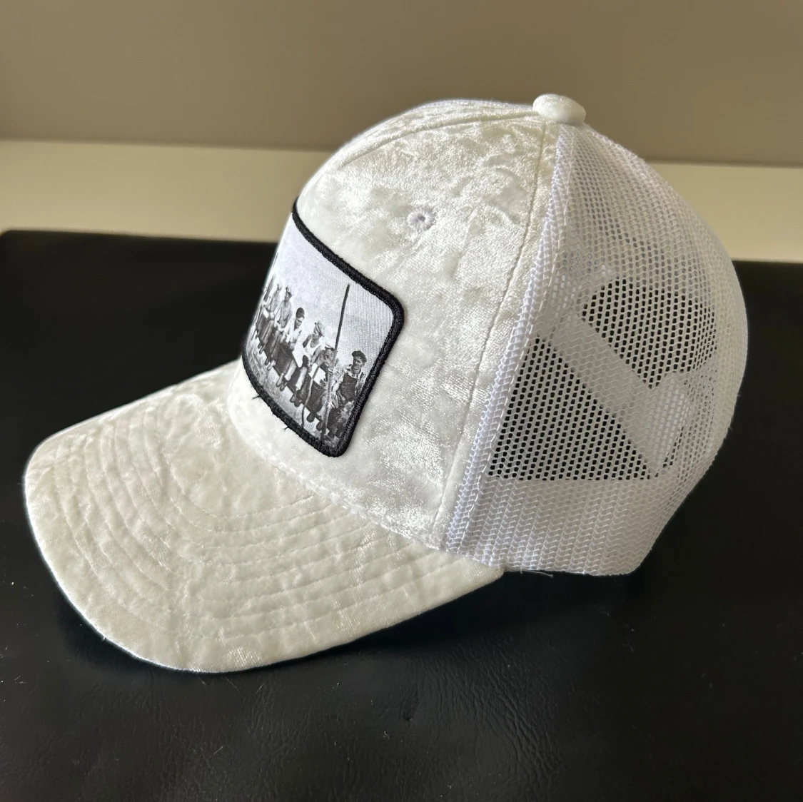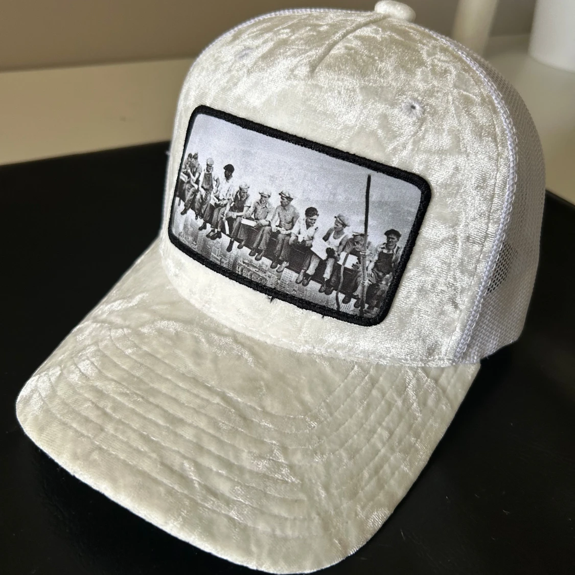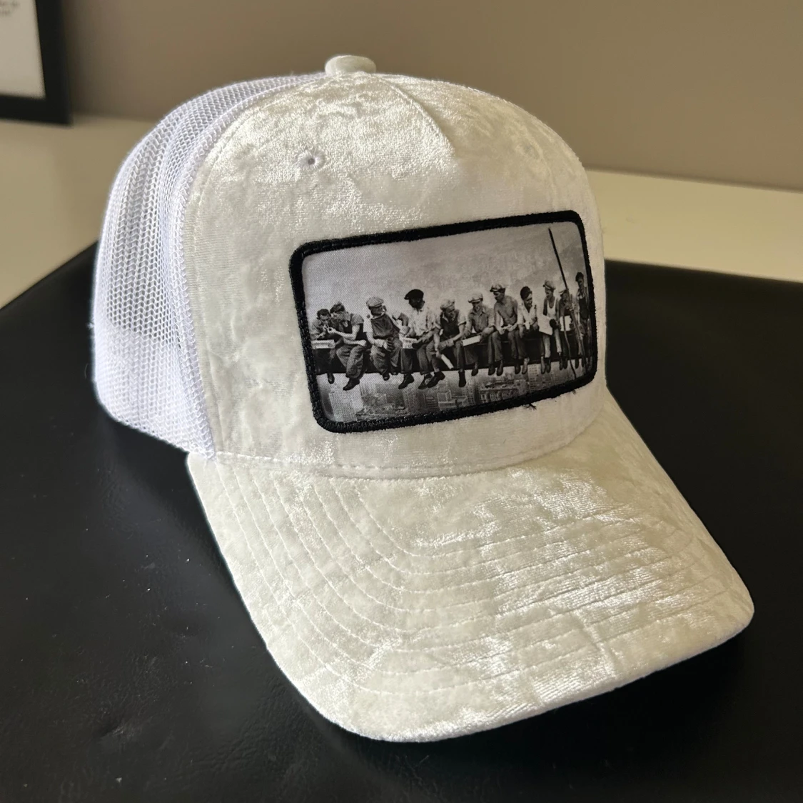 Snygg vit truckerkeps i glansig sammet med nät baktill. Framsidan har en stor svartvit applikation med det ikoniska fotot 'Lunch atop a Skyscraper'. Justerbar baktill för perfekt passform.