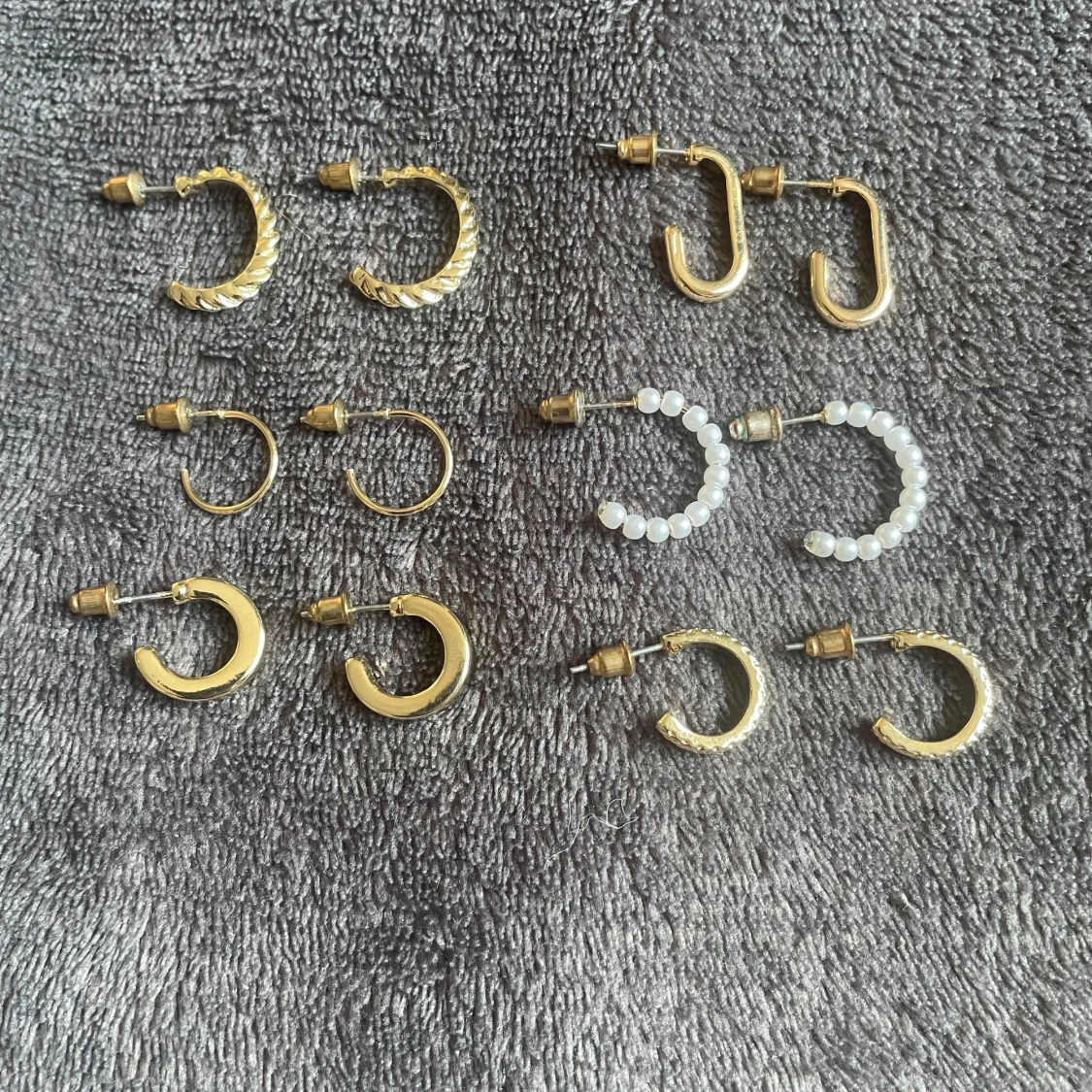 Säljer ett set med 6 par örhängen i olika former. Alla är hoops i guldig metall, ett par har tvinnad design, ett par är dekorerade med vita pärlor och resten är släta eller med enkel struktur. Perfekt för att mixa och matcha till olika outfits. 120kr för alla eller 25kr styck🫶🏻