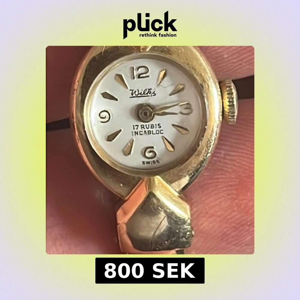 Säljer en snygg vintage armbandsklocka från Wilka med guldig metall och vit urtavla. Klockan har markerade siffror vid 12, 3, 6 och 9 samt detaljer i guld. Armbandet är stelt och matchar boetten i guldton. Mekanisk urverk med 17 rubiner och Incabloc-stötskydd.