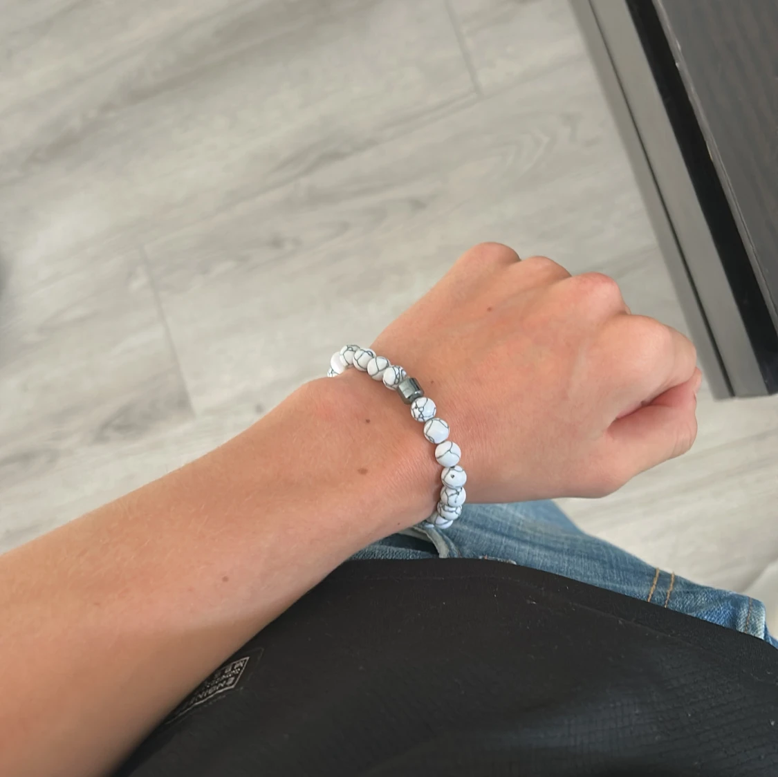 Säljer ett set med tre stilrena pärlarmband. Ett svart matt armband med silverdetalj, ett vitt armband med grå marmorering och ett blått armband med glansiga pärlor. Perfekta accessoarer för att lyfta din outfit och ge en cool vibe. Säg till om det behövs fler bilder så löser jag de!