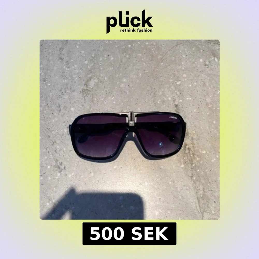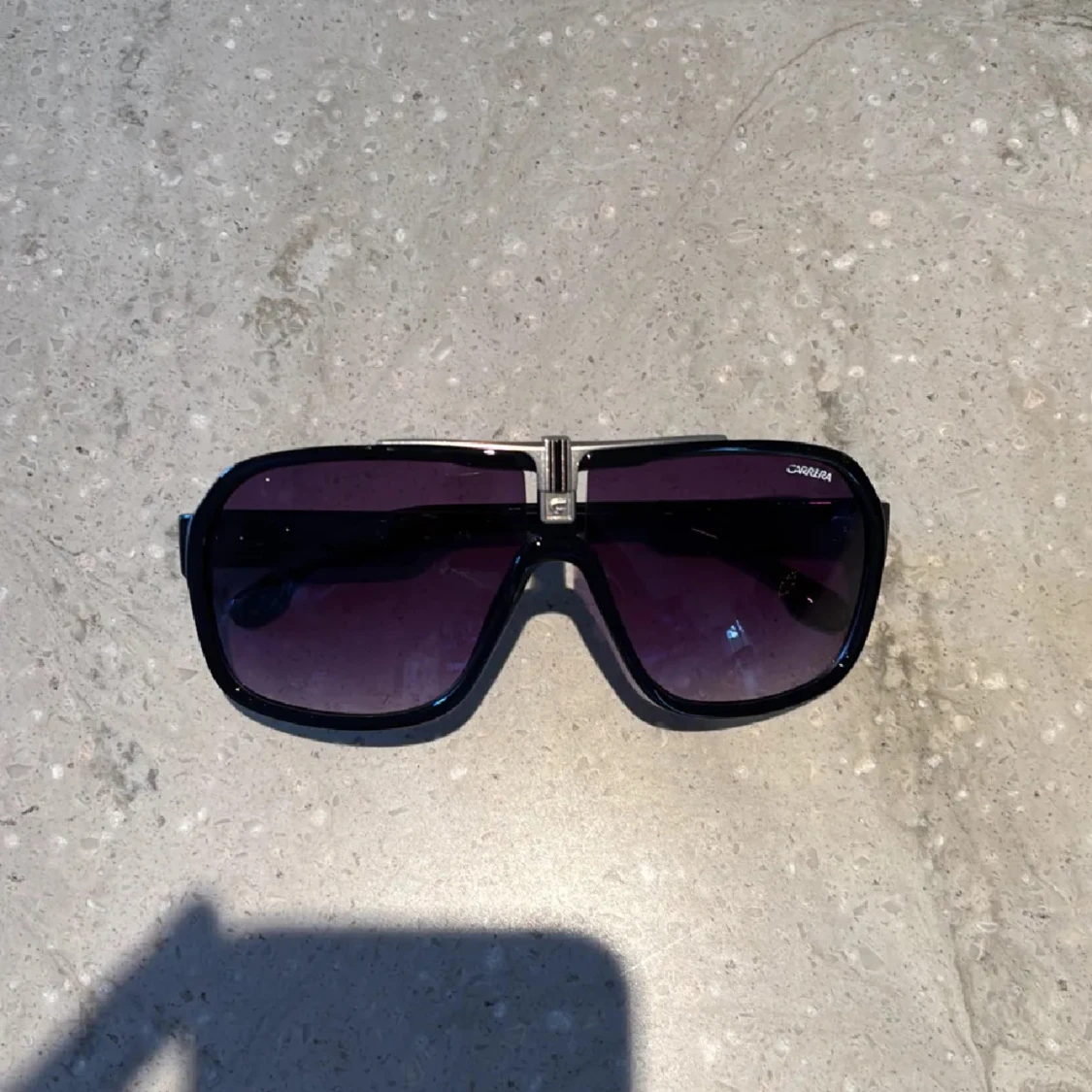 Snygga svarta Carrera solglasögon med stor shield-formad lins och mörka tonade glas. Ramen är i blank svart plast med silverfärgad detalj vid bryggan och Carrera-logga på skalmarna. Perfekt för dig som vill sticka ut med en sportig och retro vibe.