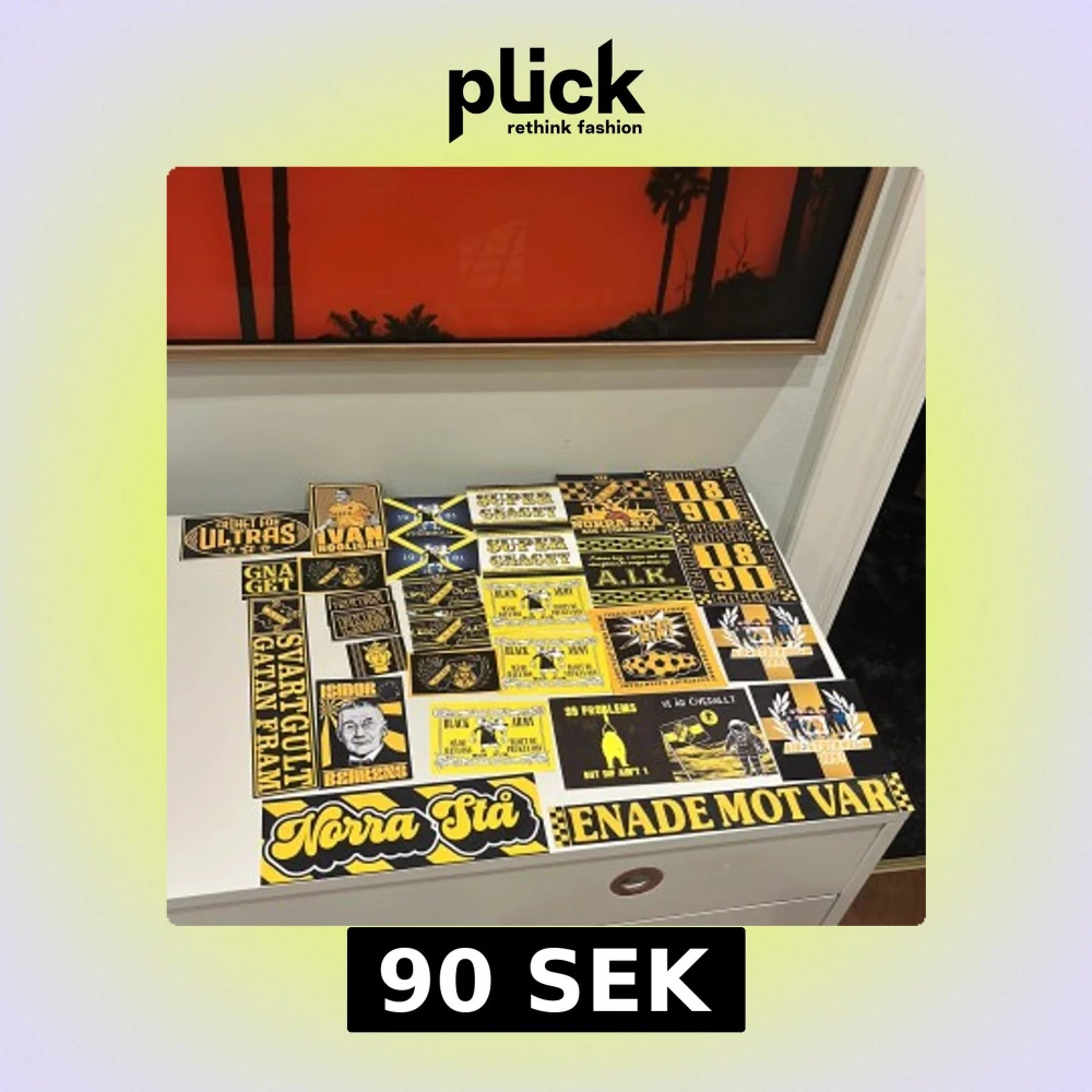 Samling med AIK Stockholm-klistermärken i svart och gult, perfekta för fans av fotbollslaget. Motiv med supporterbudskap, Norra Stå, Black Army och ultras-tema. Perfekt för att visa ditt stöd på väskan, datorn eller skateboarden. 3 kr styck