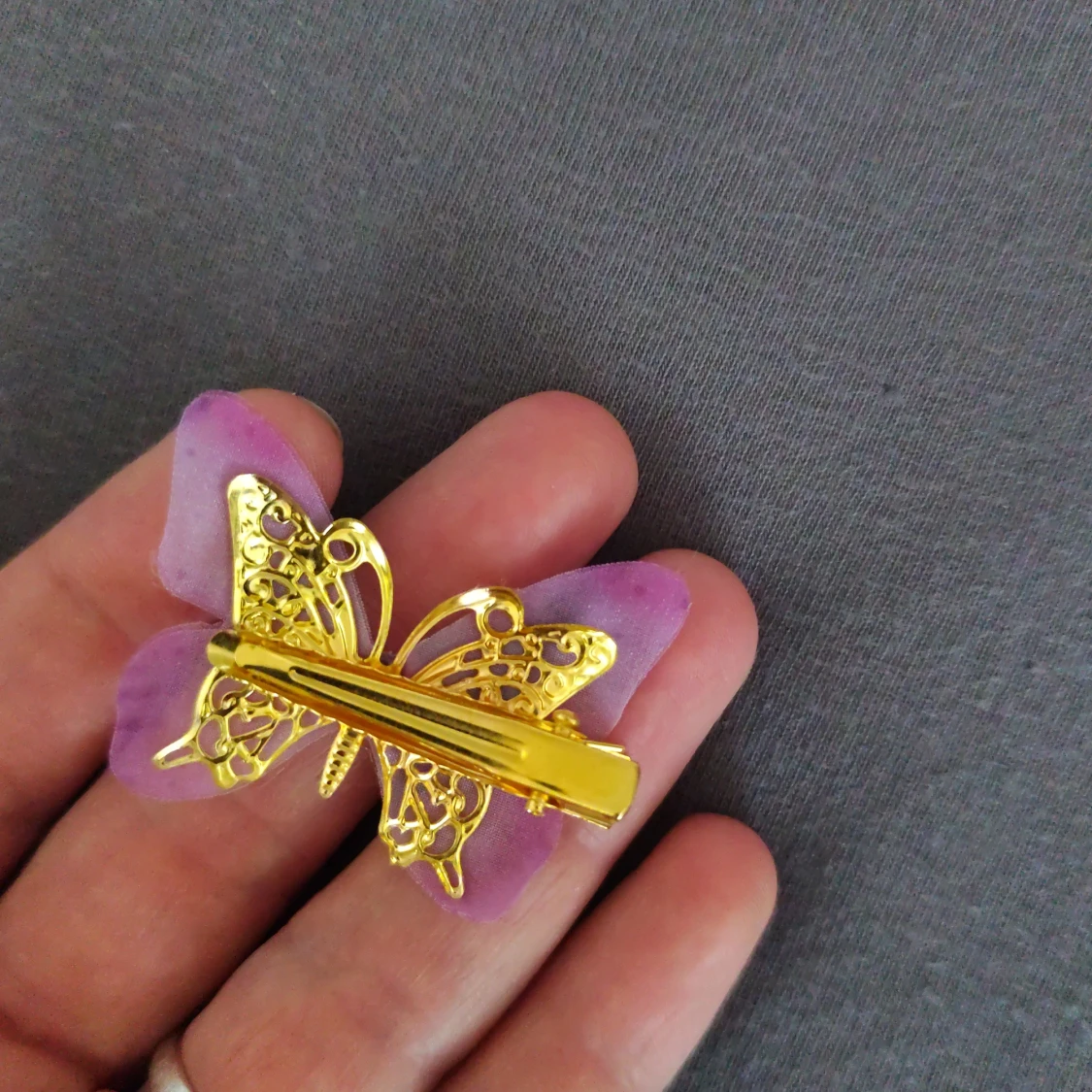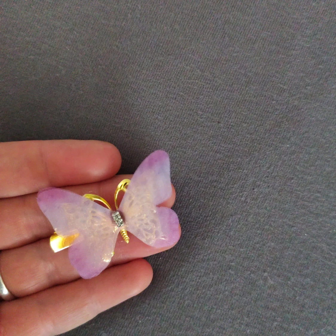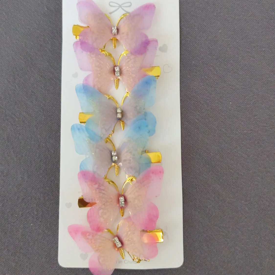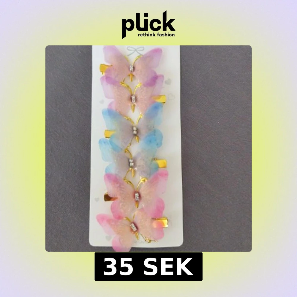 Ny.Säljer ett set med fem fjärilsformade hårspännen i pastellfärger som rosa, lila och blå. Spännena har guldfärgade detaljer och glittriga stenar i mitten för extra bling. Perfekt accessoar för att piffa upp frisyren med en söt och färgglad touch.