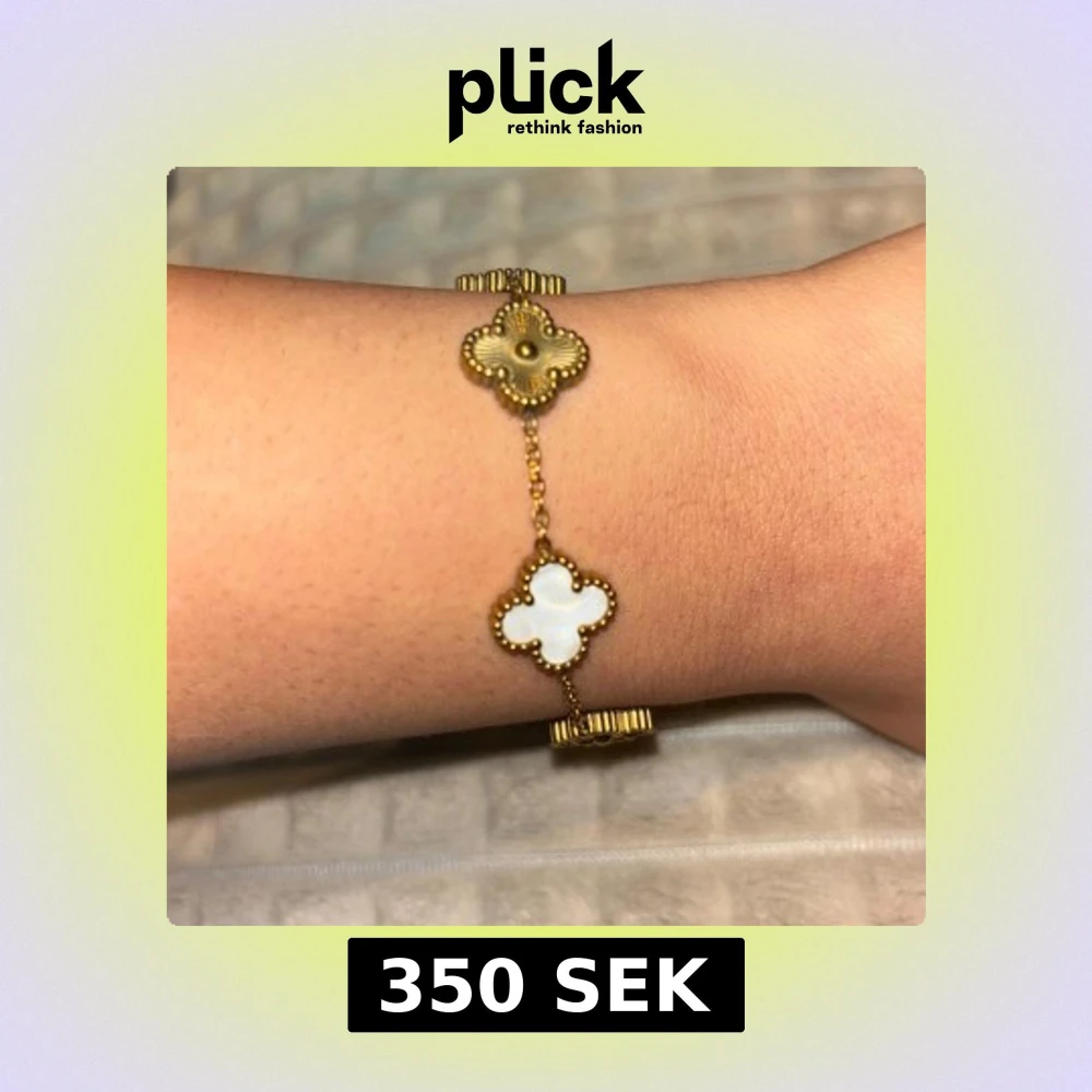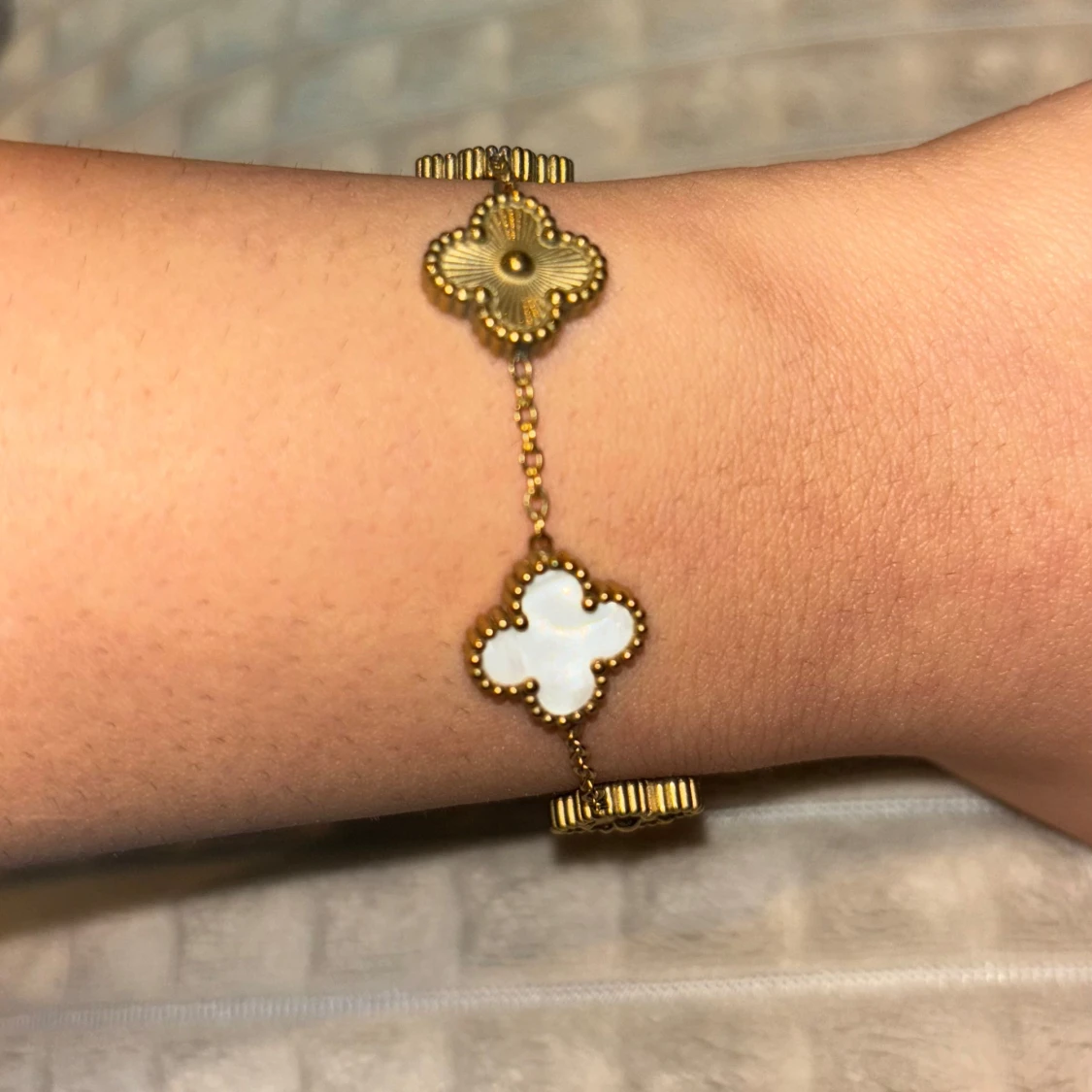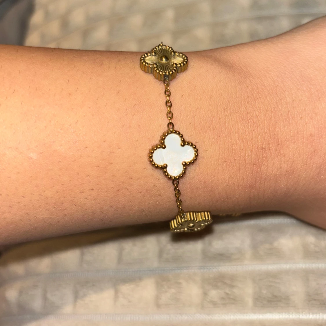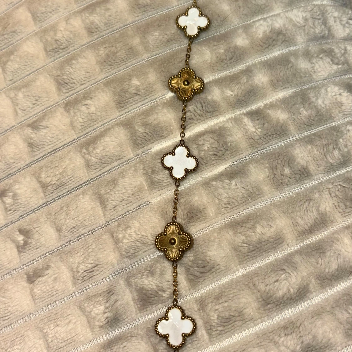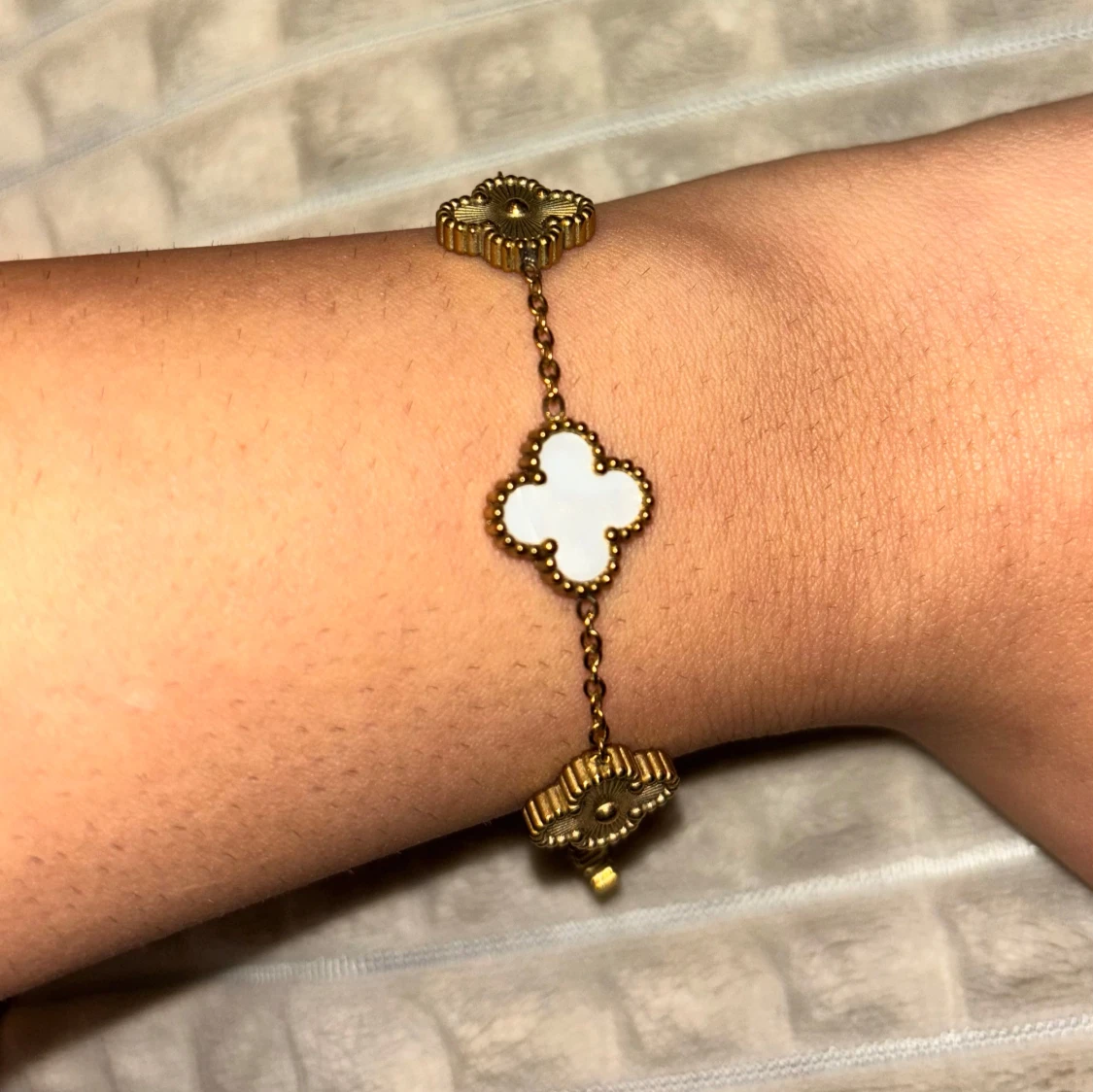 Elegant guldarmband med fyrklöverformade länkar. Varje länk har en vit inläggning som ger en fin kontrast mot guldfärgen. Perfekt för att lägga till en touch av lyx till din stil. Guldpläterad!