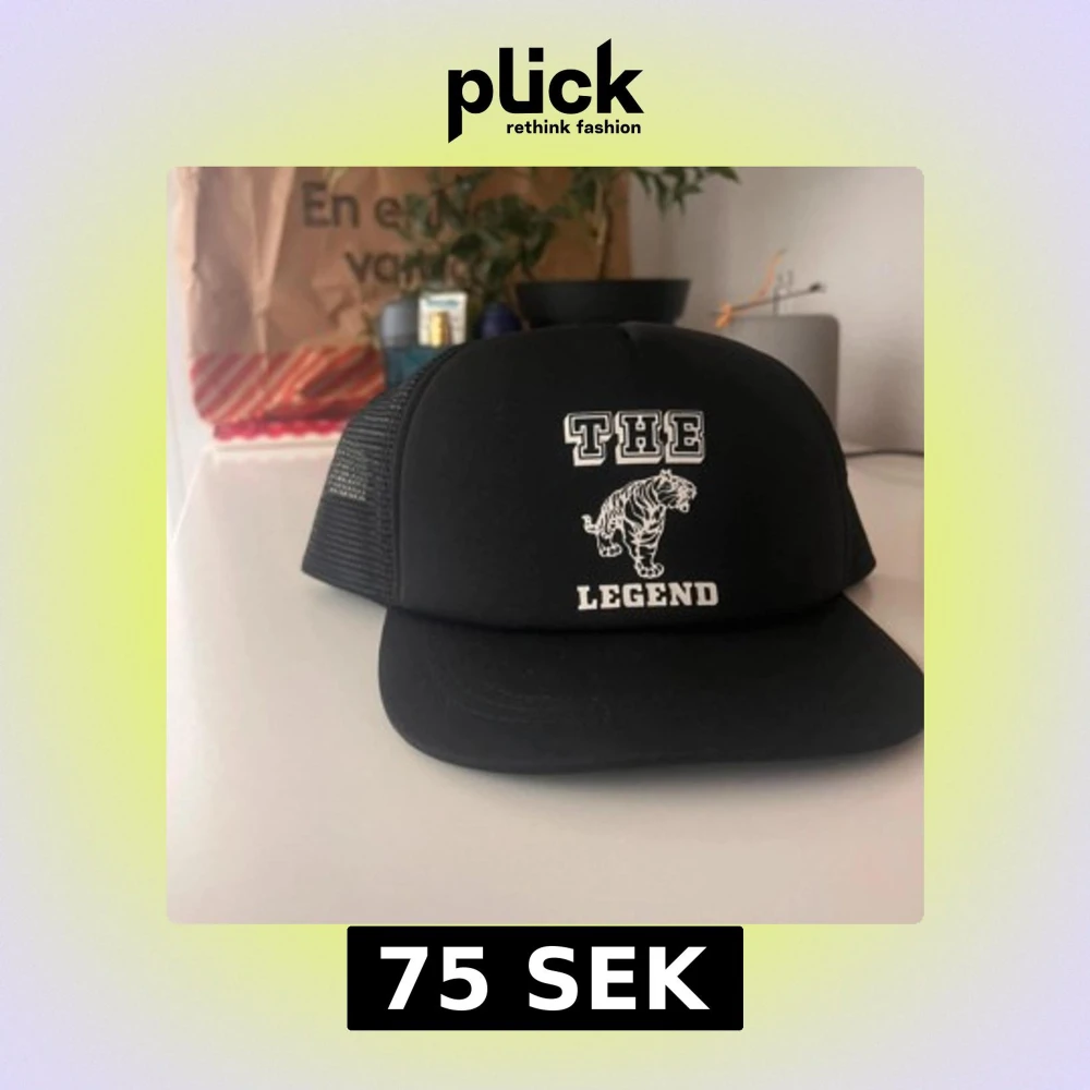Svart truckerkeps med vit text 'THE LEGEND' och en cool tiger på framsidan. Kepsen har böjd skärm och mesh på sidorna och bak för extra ventilation. Perfekt för dig som vill sticka ut med en sportig och trendig look.