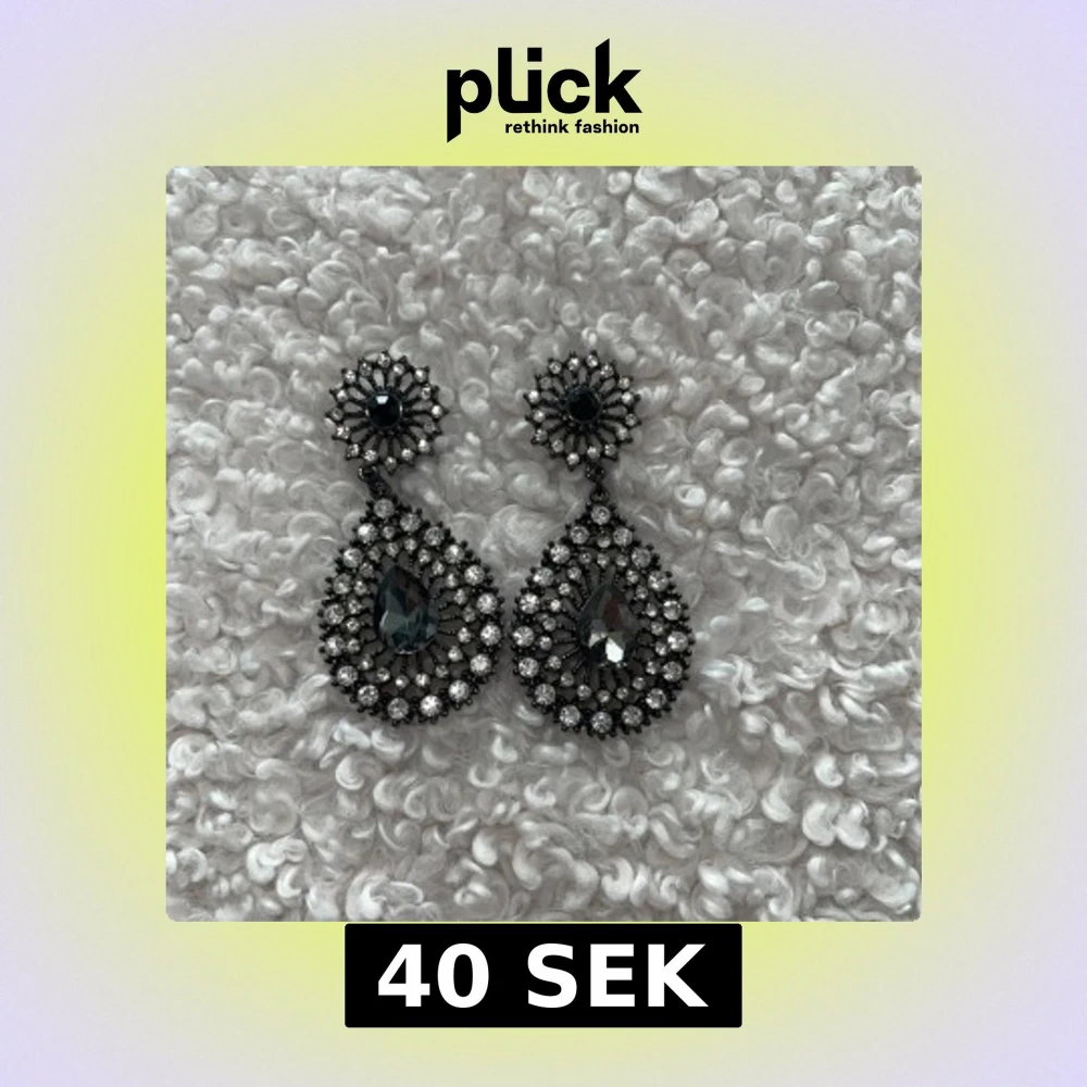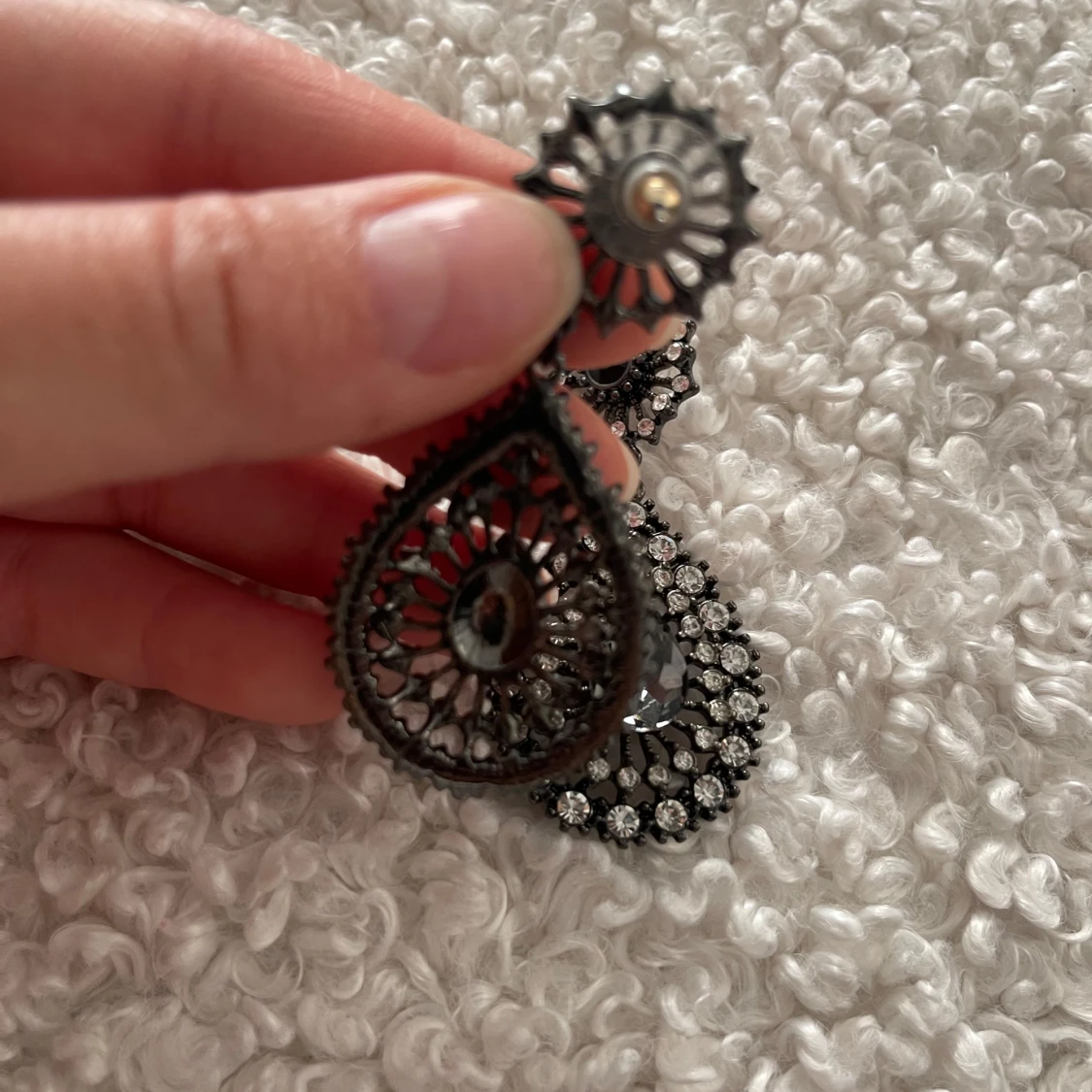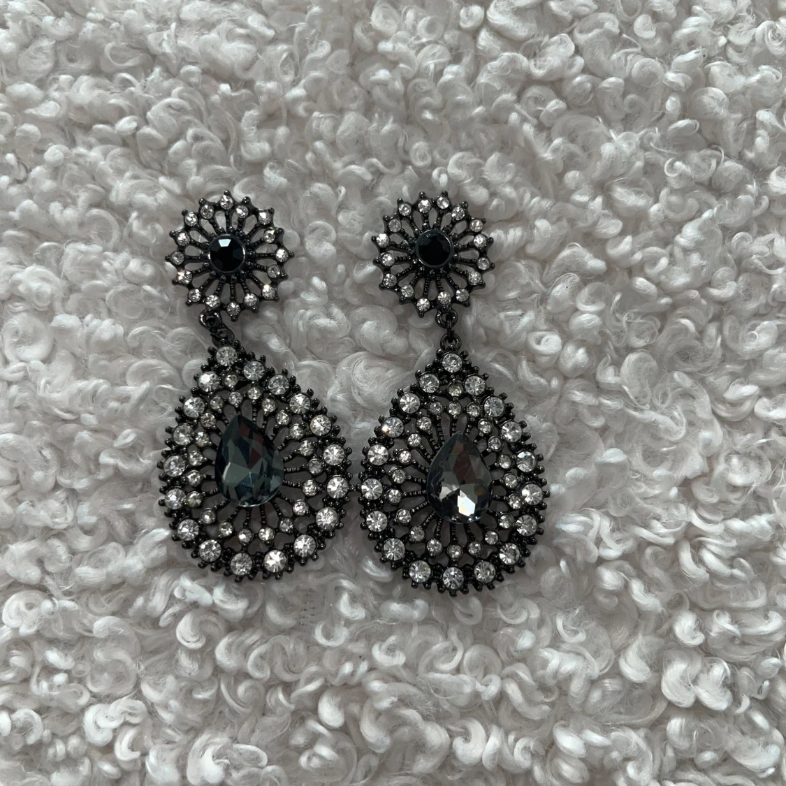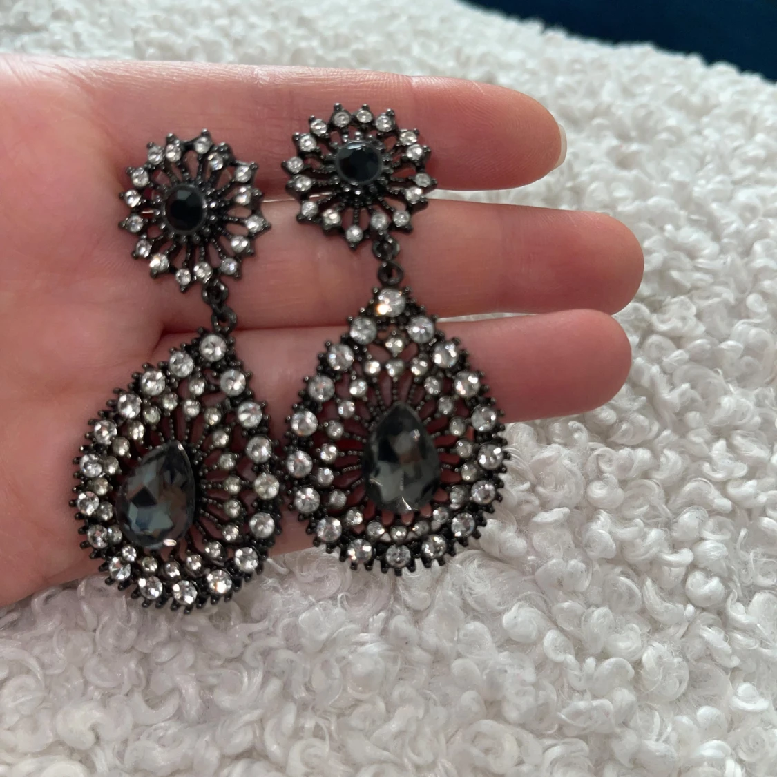 Snygga stora örhängen i svart metall med droppformad design och massor av glittrande stenar. De har en cool vintagekänsla och är perfekta för att sticka ut. Stenarna är klara och svarta, och hela örhänget har en lyxig vibe med mycket bling.