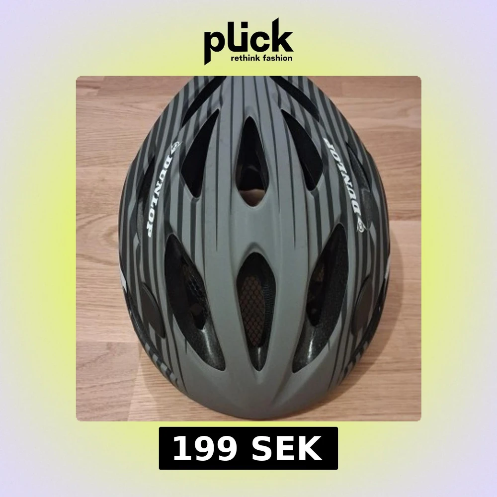 Snygg cykelhjälm från Dunlop i grått och svart med coola ränder. Ventilerad design med flera öppningar och justerbart spänne för perfekt passform. Tillverkad i lätt syntetmaterial med mjuk insida och nät för extra komfort.