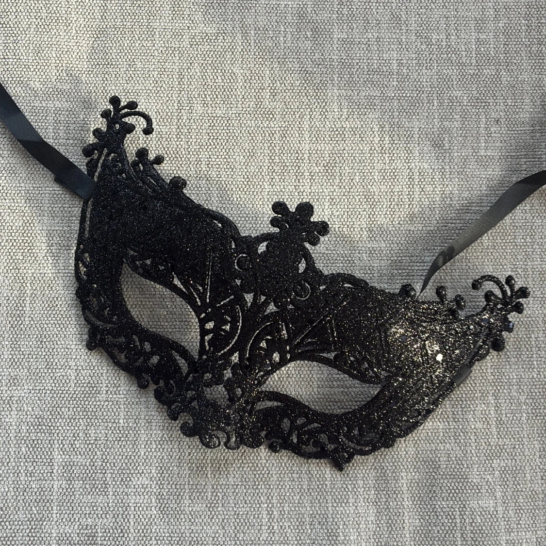 Snygg svart maskeradmask med glittrig yta och detaljerad, utskuren design. Masken har svarta band för att knyta runt huvudet och passar perfekt till maskerad eller fest. Materialet är lätt och smidigt, med coola ornament och blommiga former.
