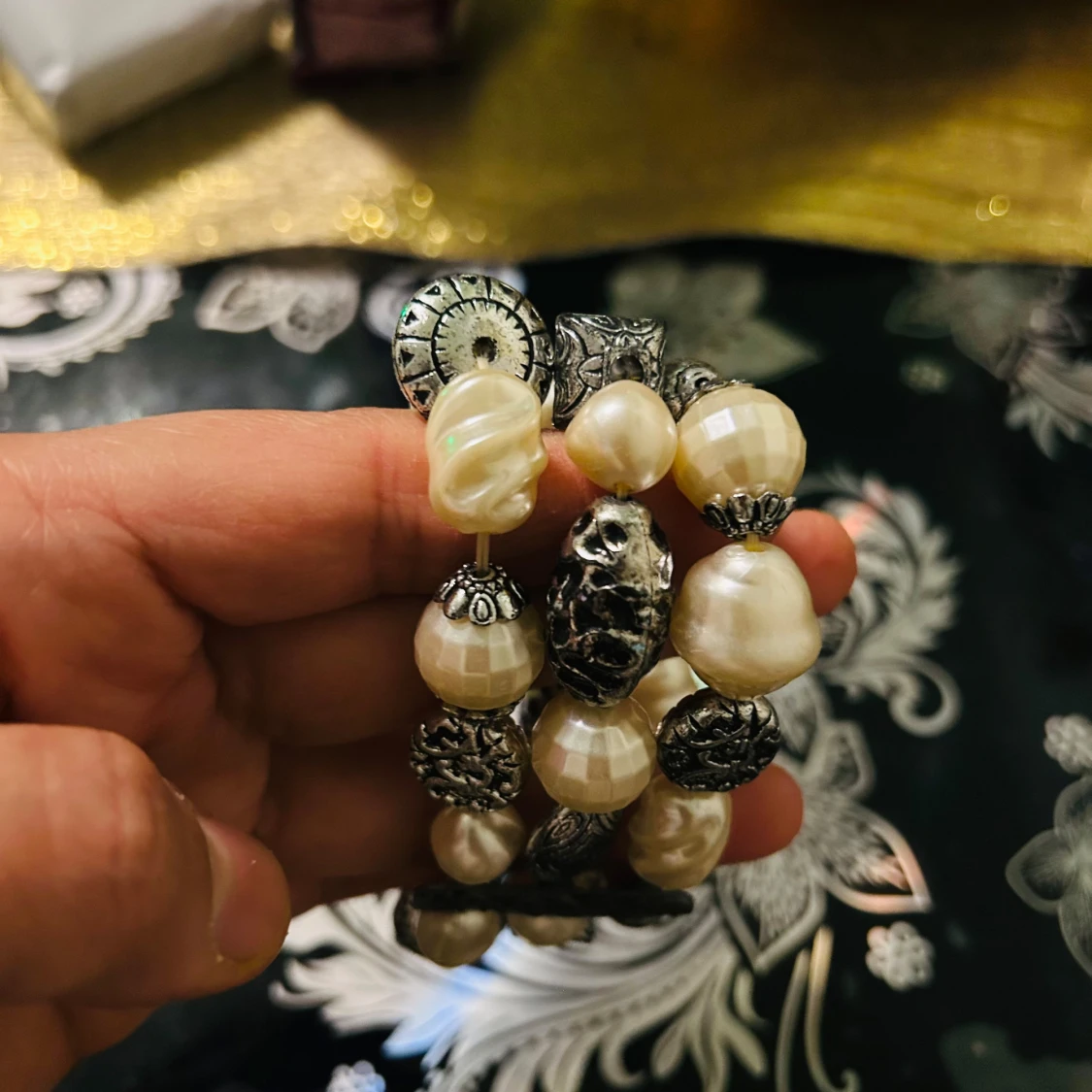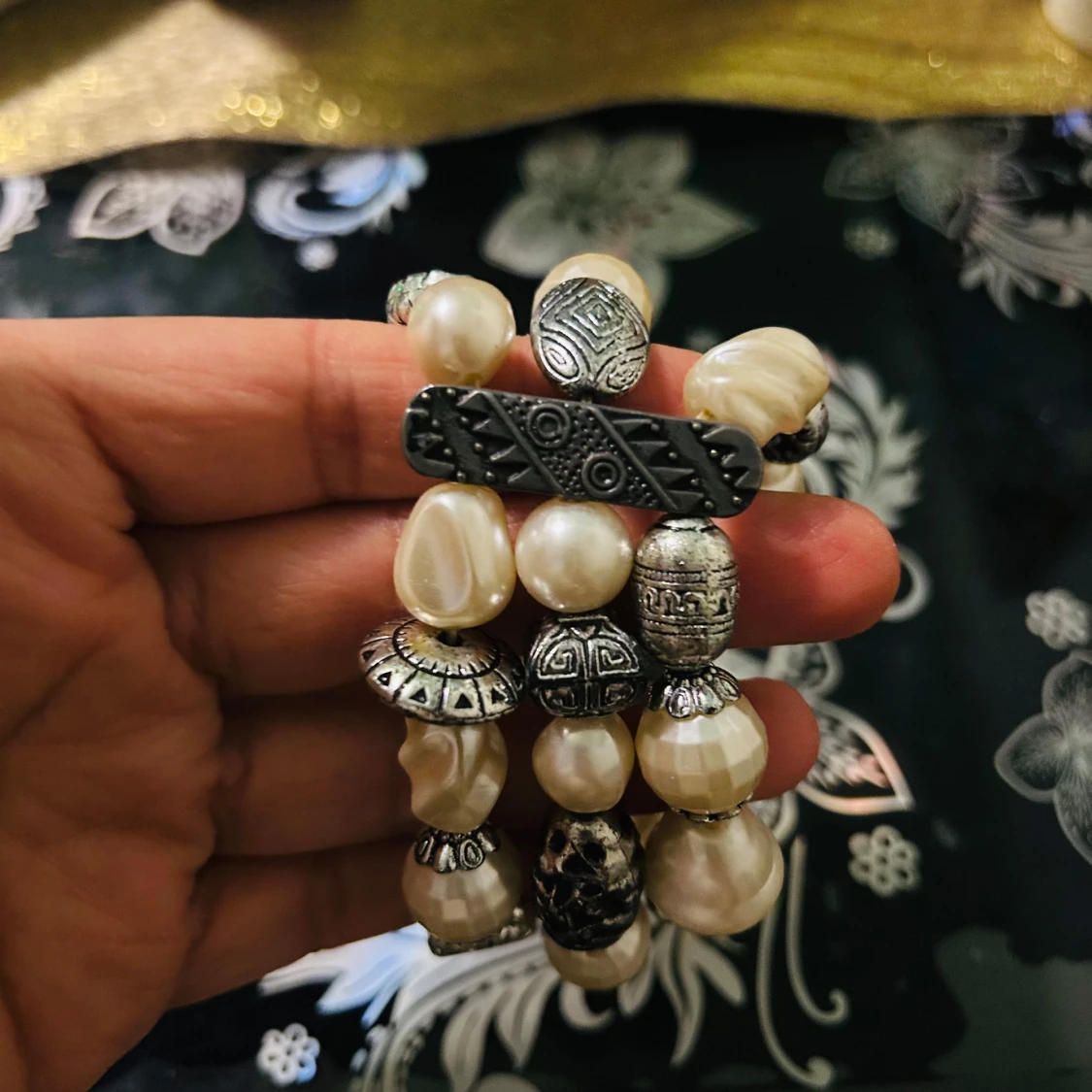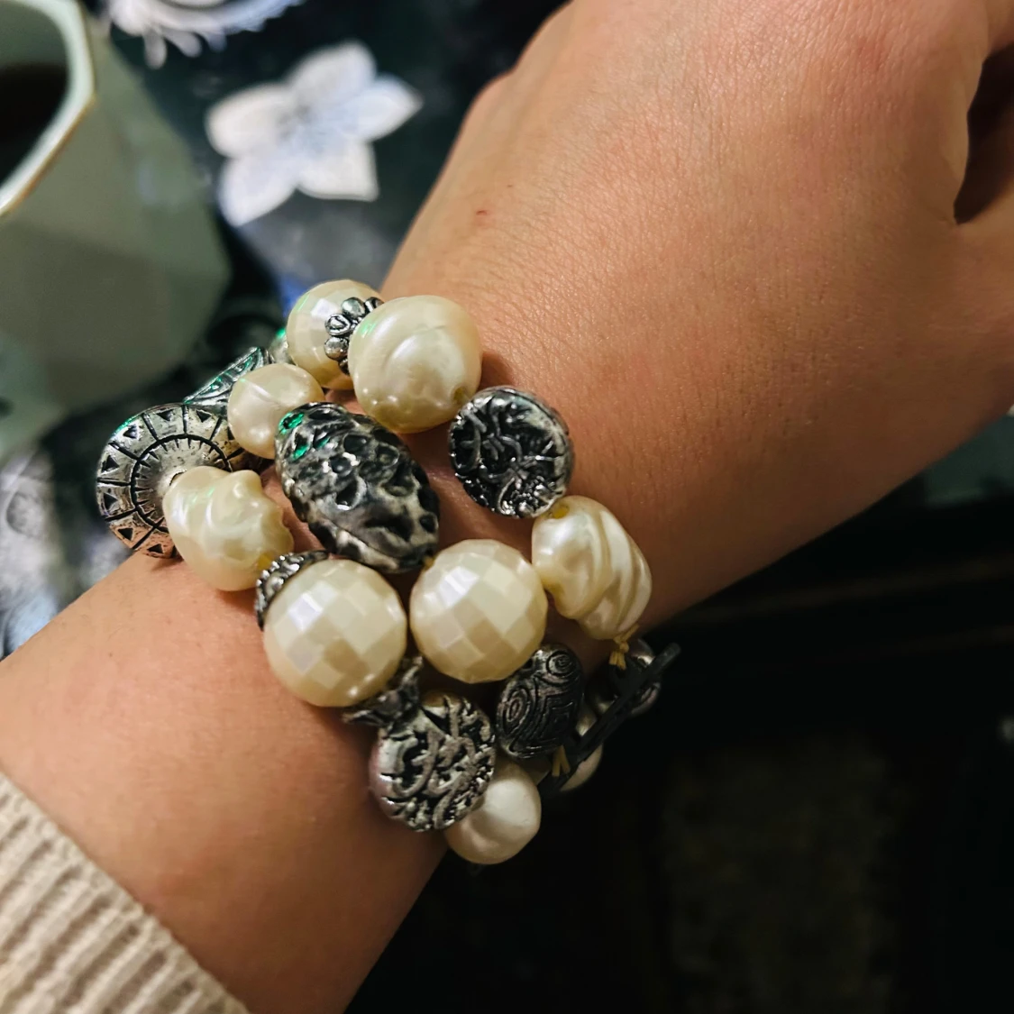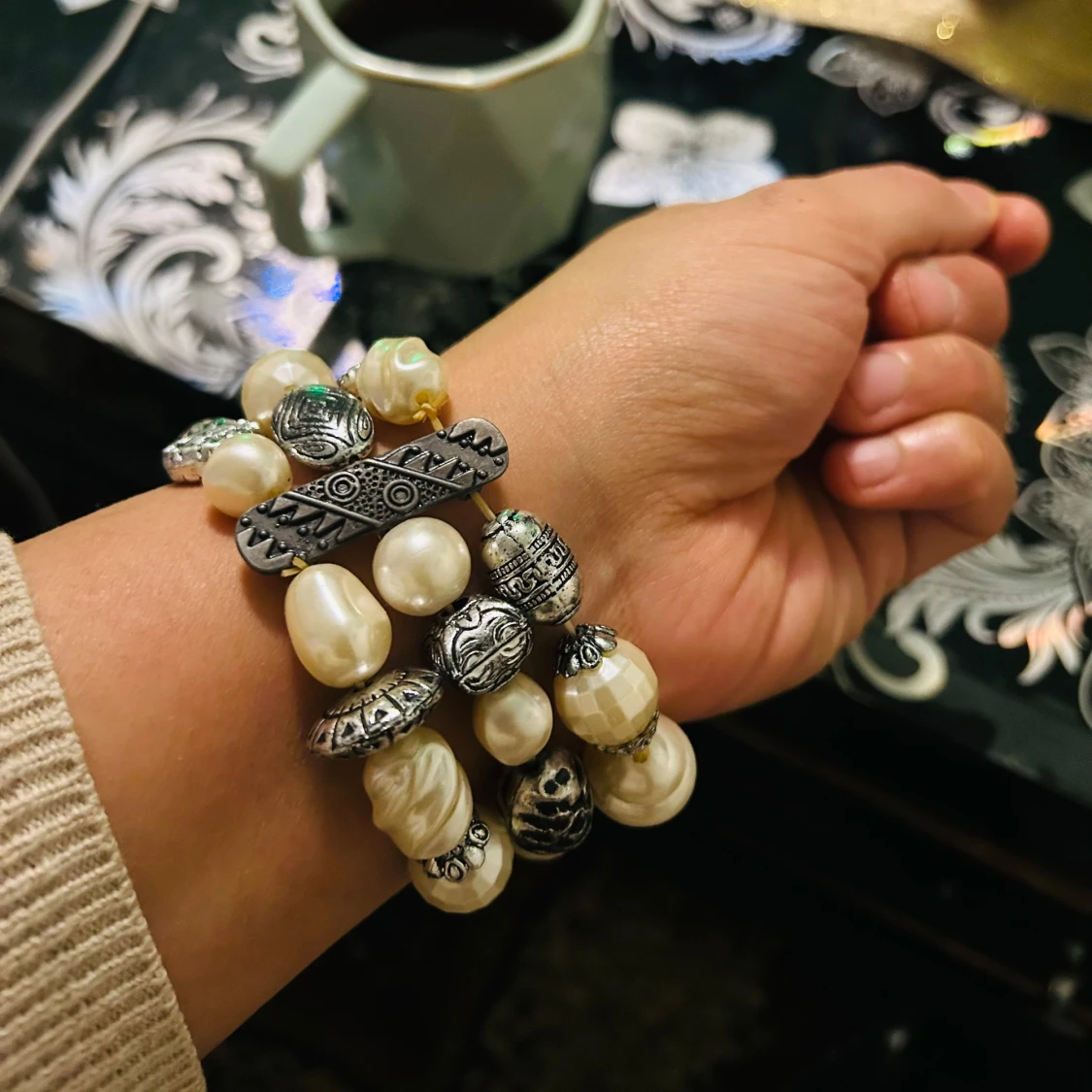 Snyggt elastiskt armband med stora krämfärgade pärlor och detaljerade metallpärlor i antik stil. Perfekt för att ge en bohemisk touch till din outfit. Armbandet är stretchigt och passar de flesta handleder.