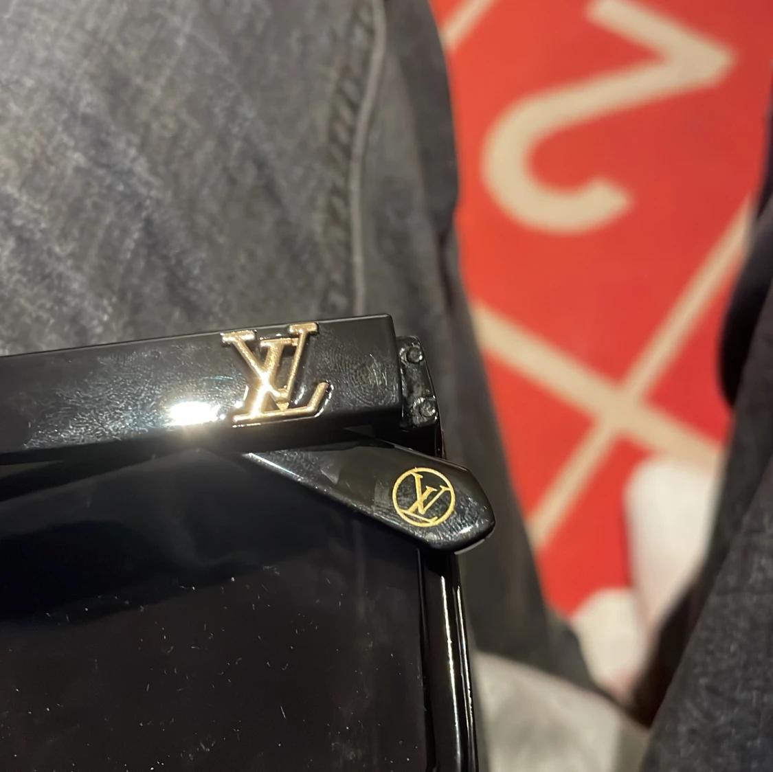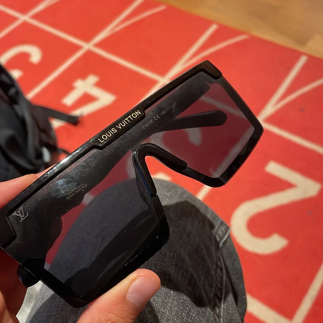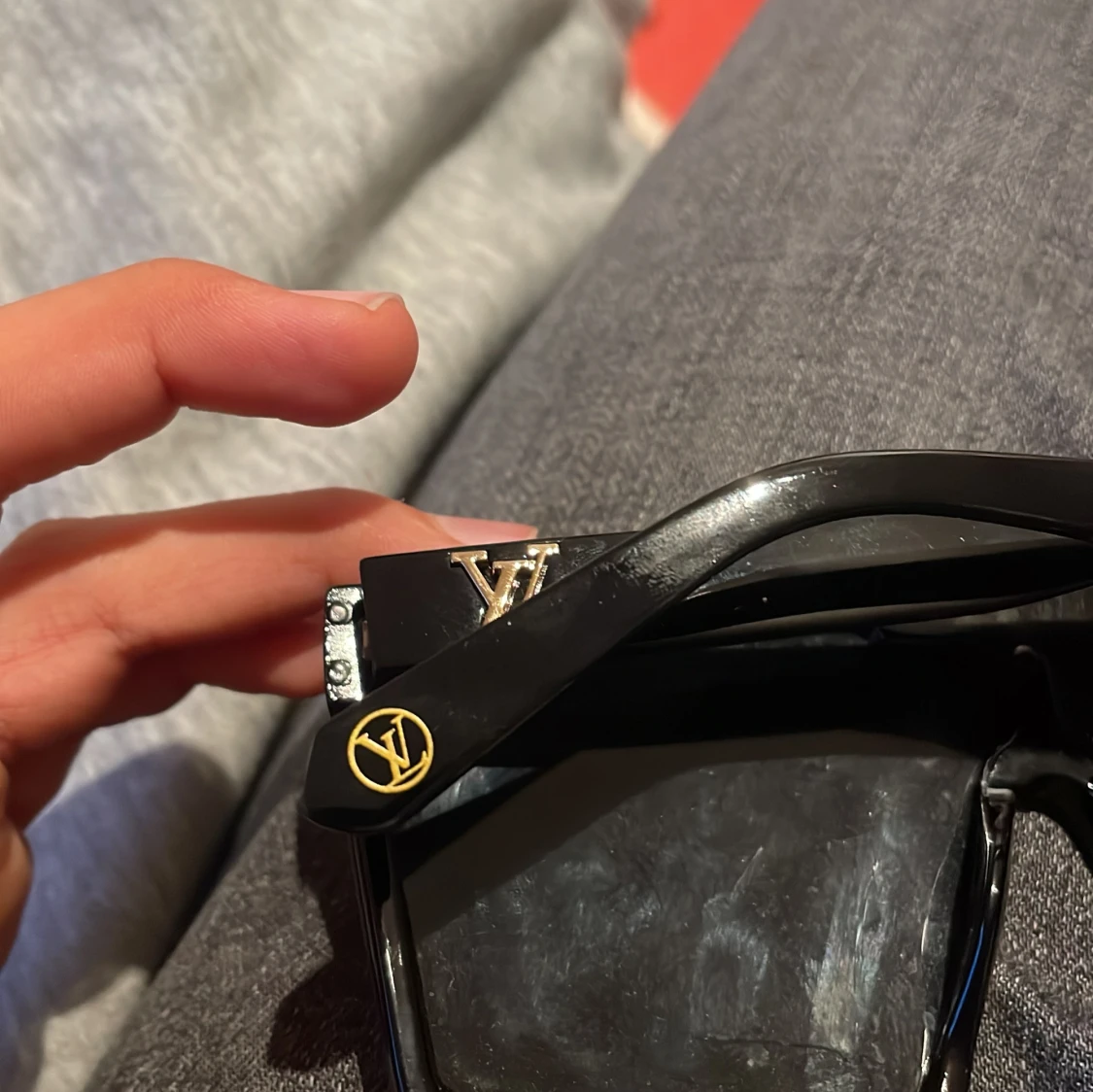 Säljer ett par svarta Louịs solglasögon med bred, rektangulär form och coola LV-detaljer i guld på bågarna. Glasögonen har en chunky design och mörka linser, perfekt för dig som vill sticka ut med en lyxig och modern look.