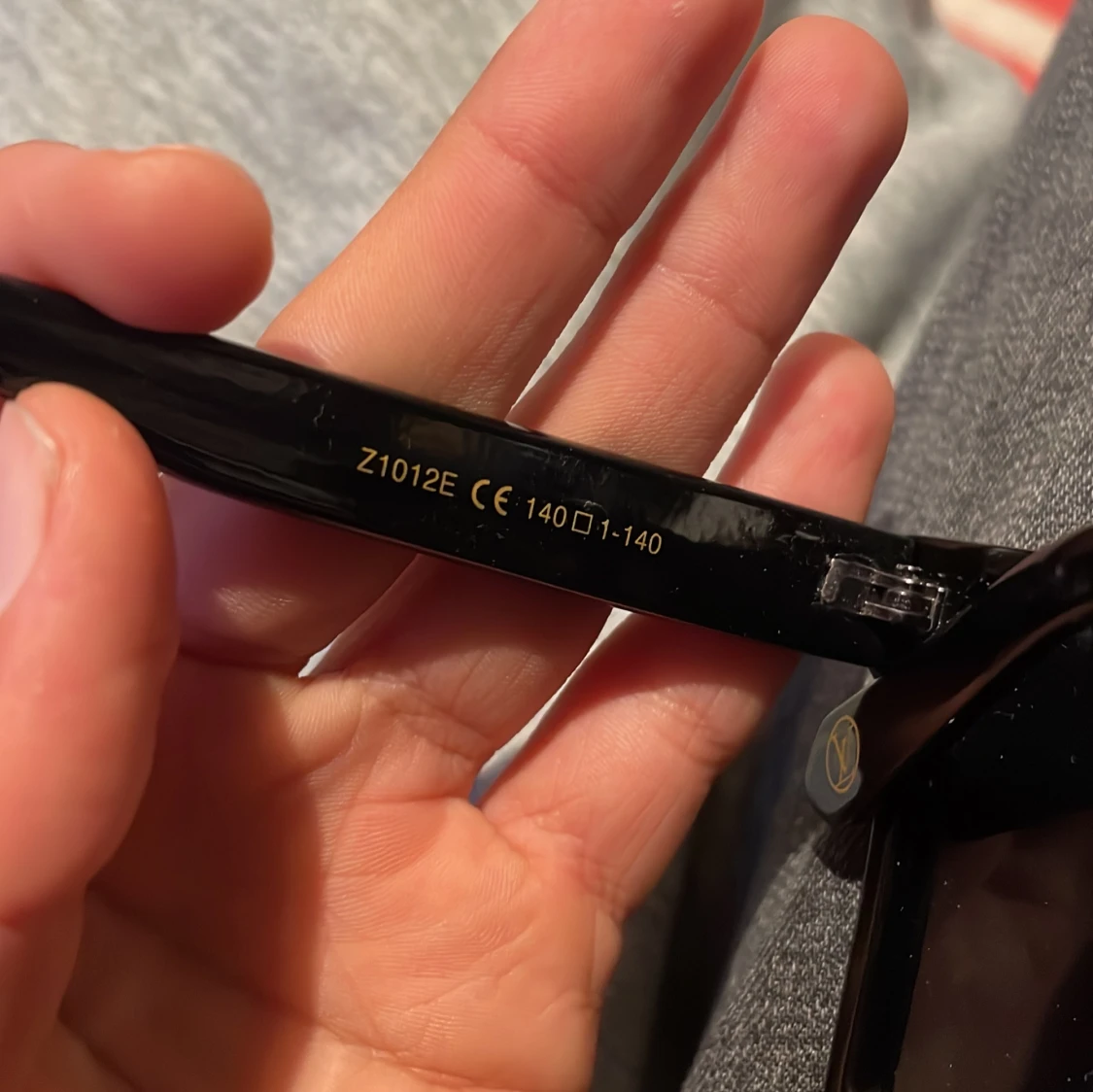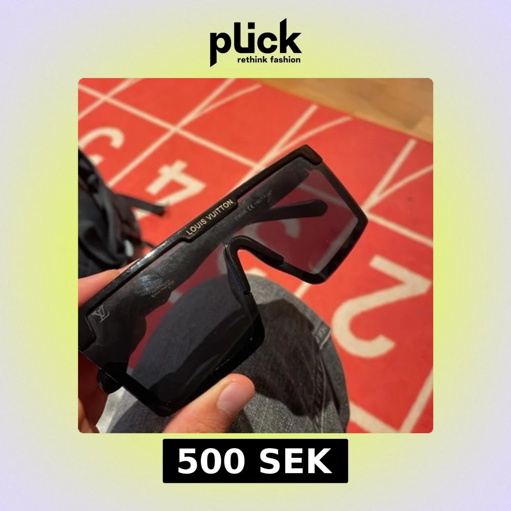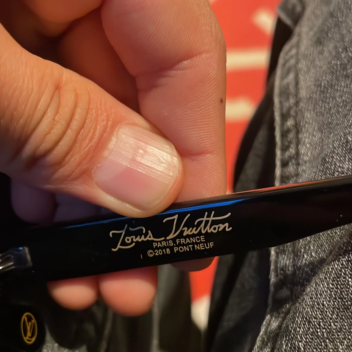 Säljer ett par svarta Louịs solglasögon med bred, rektangulär form och coola LV-detaljer i guld på bågarna. Glasögonen har en chunky design och mörka linser, perfekt för dig som vill sticka ut med en lyxig och modern look.