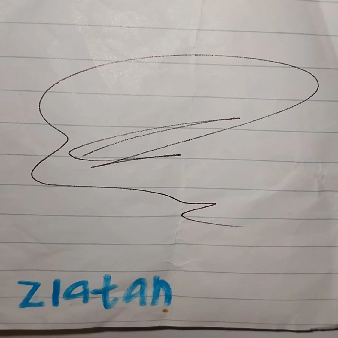 Unik autograf av Zlatan Ibrahimovic på ett vitt, linjerat papper. Namnet 'zlatan' är skrivet i blått längst ner. Perfekt för dig som älskar fotboll och vill ha något riktigt speciellt att visa upp.