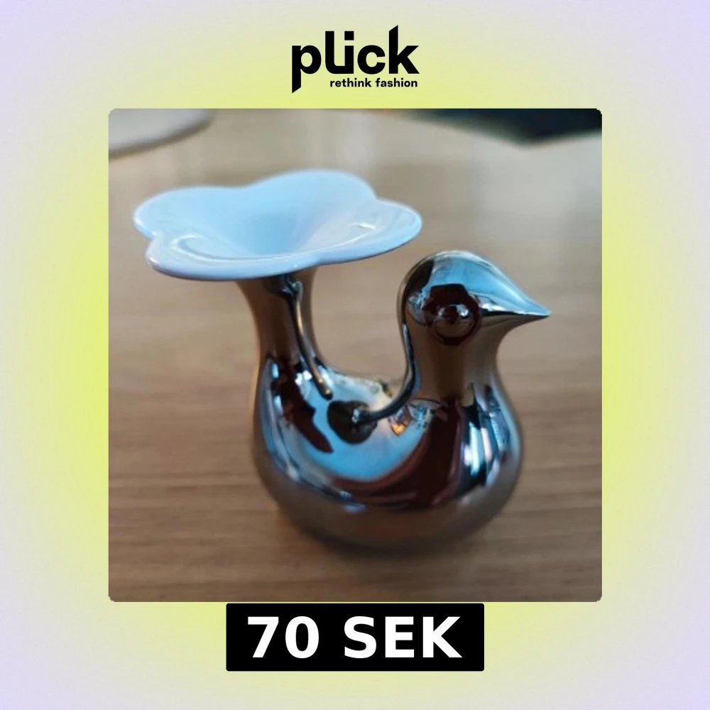 Superfin ringhållare från Arzberg i form av en fågel med spegelblank silverfärgad kropp och en vit blomformad skål på ryggen. Perfekt att förvara dina ringar på ett snyggt och stilrent sätt på sminkbordet eller nattduksbordet.