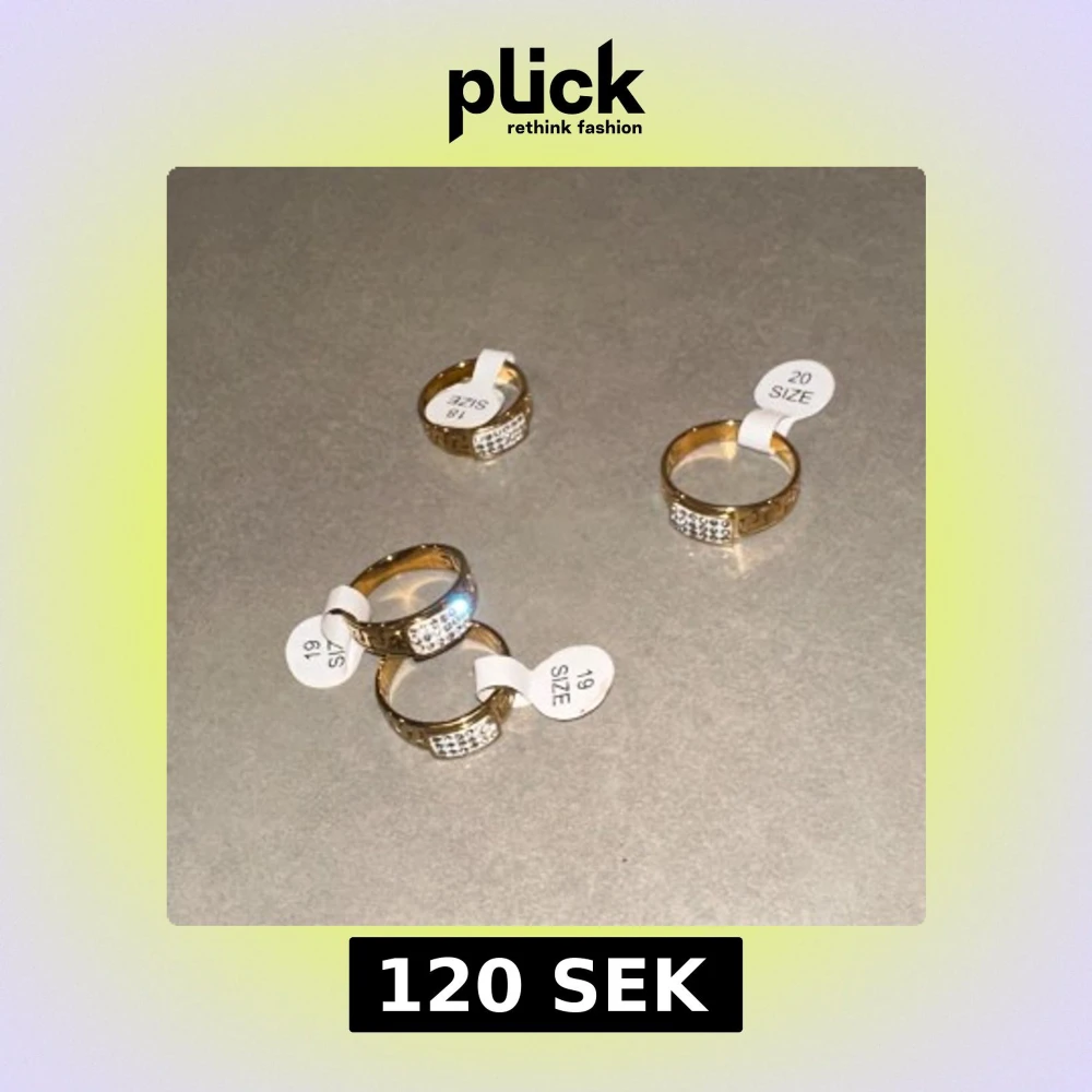 Säljer flera snygga guldiga ringar med glittriga stenar framtill. Ringen har en klassisk rund form och är dekorerad med små, skimrande stenar som ger extra bling. Perfekt för dig som vill ha något som sticker ut och glänser.
