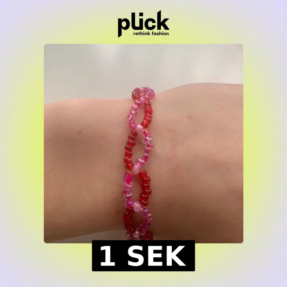 Unikt armband med små pärlor i rött och rosa. Armbandet har en flätad design som ger en lekfull och färgglad look. Perfekt för att lägga till en pop av färg till din outfit! Kostar bara 15kr!