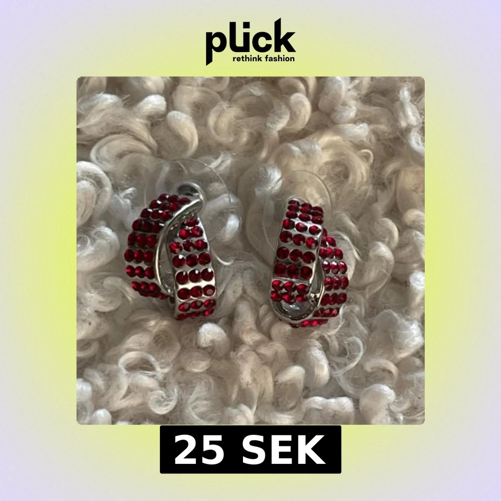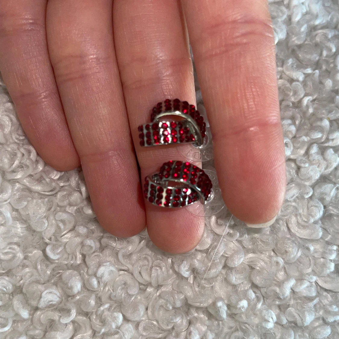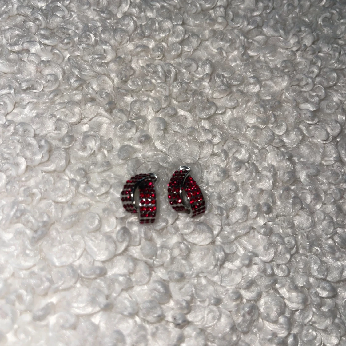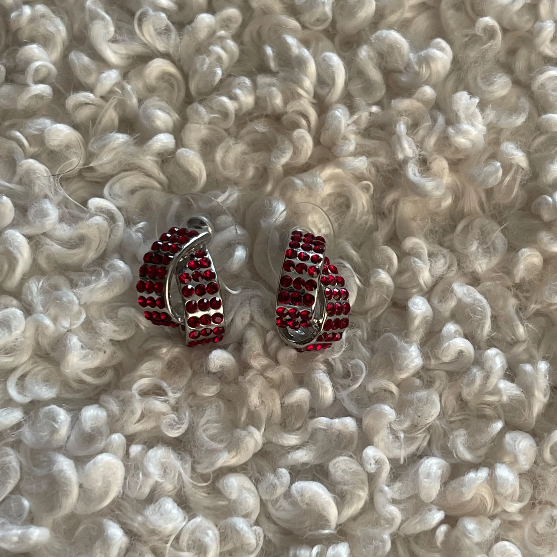 Snygga silvriga örhängen med böjd form och tätt med röda glittrande stenar. De har en chunky look och ger ett riktigt statement till din stil. Perfekta för dig som gillar att sticka ut med accessoarer.
