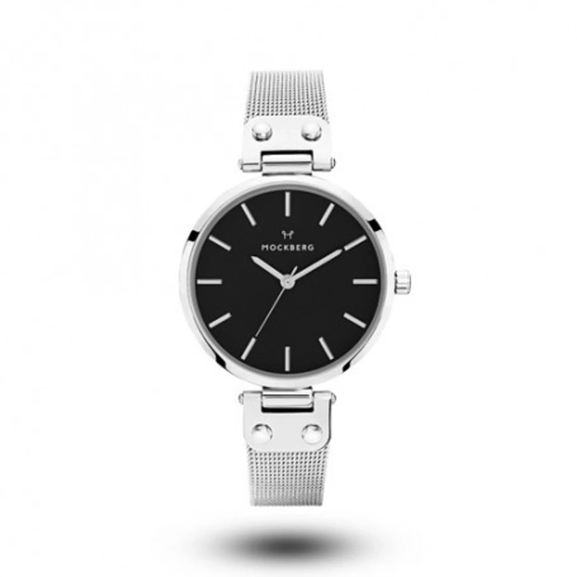 Stilren klocka från Mockberg med svart rund urtavla och silverfärgat mesharmband. Klockan har minimalistisk design med tydliga markeringar och en tunn boett i metall. Perfekt accessoar för dig som gillar klassisk och modern stil.