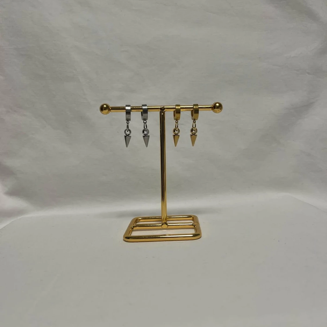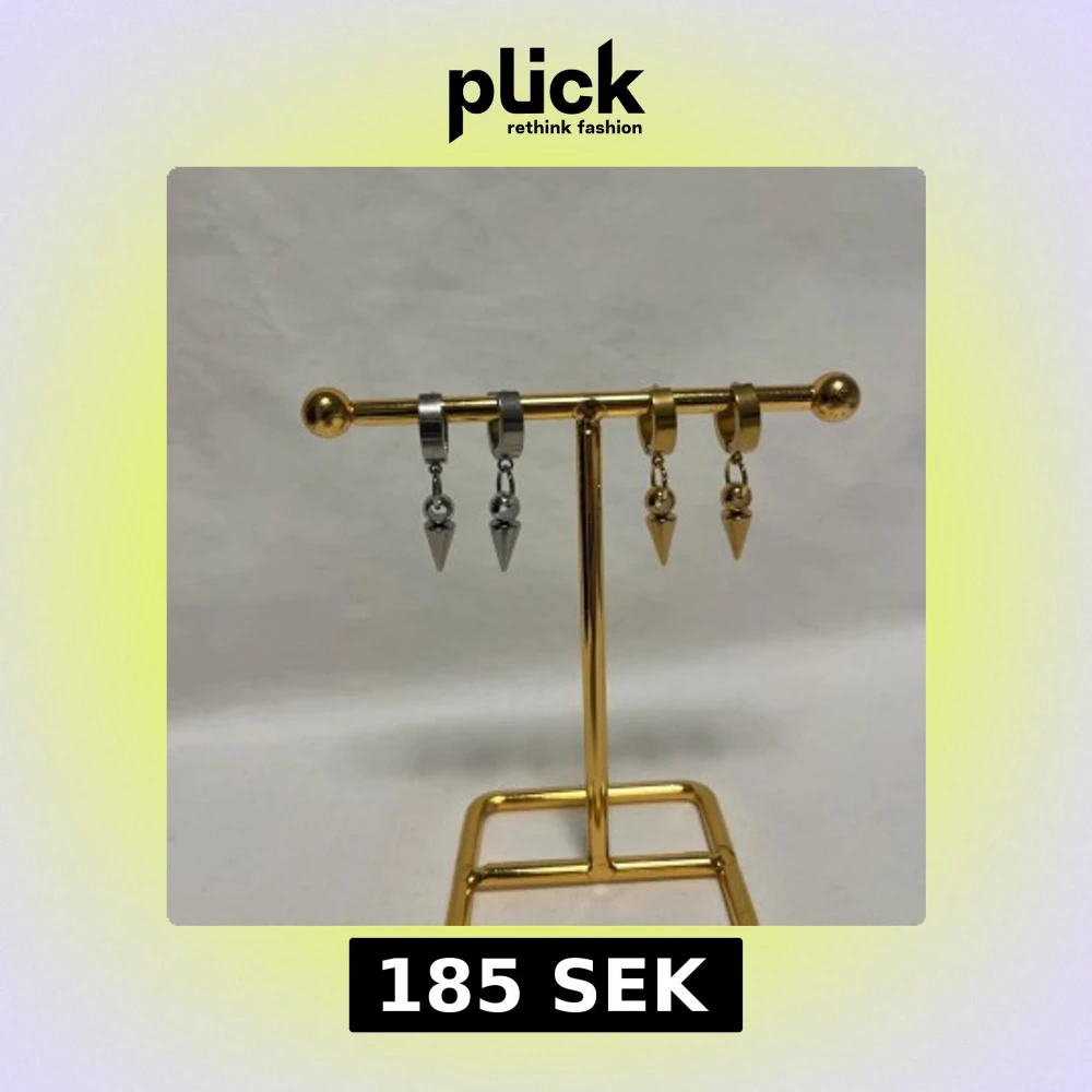 Två par chunky hoops med hängande konformad detalj. Ena paret är i blankt silverfärgat metall och det andra i guldtonad metall. Snyggt edgy och minimalistiskt uttryck, passar dig som gillar att sticka ut med accessoarer.