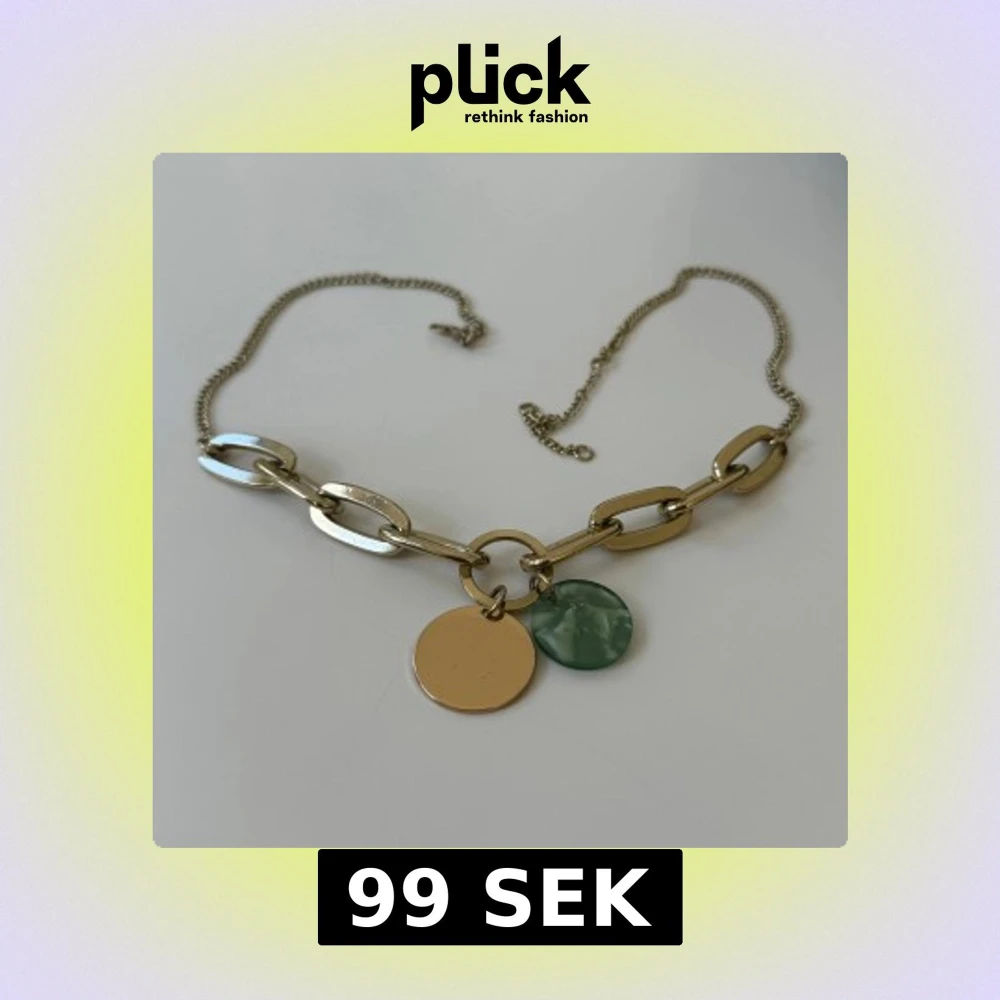 Stilrent halsband med grova länkar i guldton och två medaljonger, en i guld och en i marmorerad grön. Perfekt för att ge din outfit en cool edge. Justerbar längd med kedja och lås baktill.