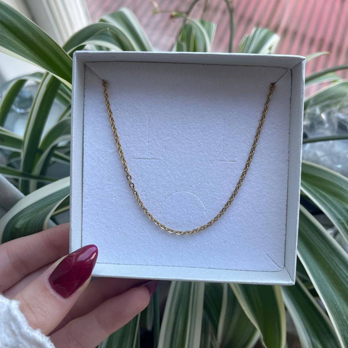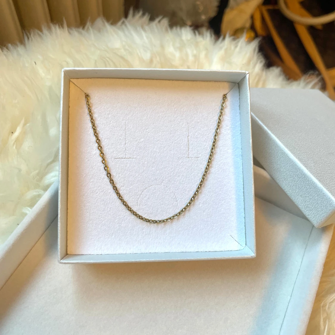 Enkel och stilren tunn halskedja i guldton. Kedjan har en klassisk länkdesign som passar perfekt för dig som gillar minimalistiska smycken. Redo att ges bort eller användas direkt. I rostfritt stål!