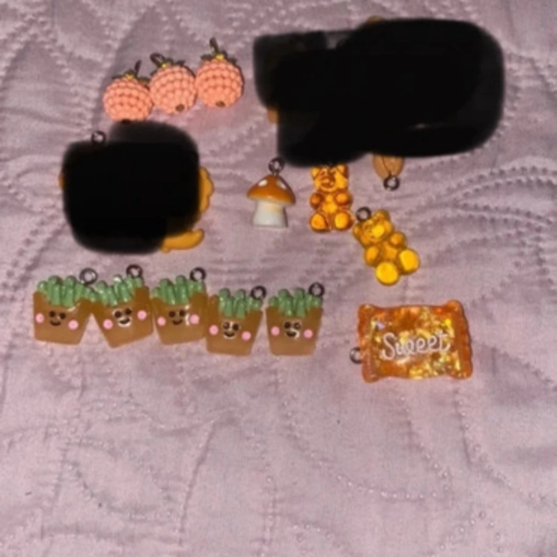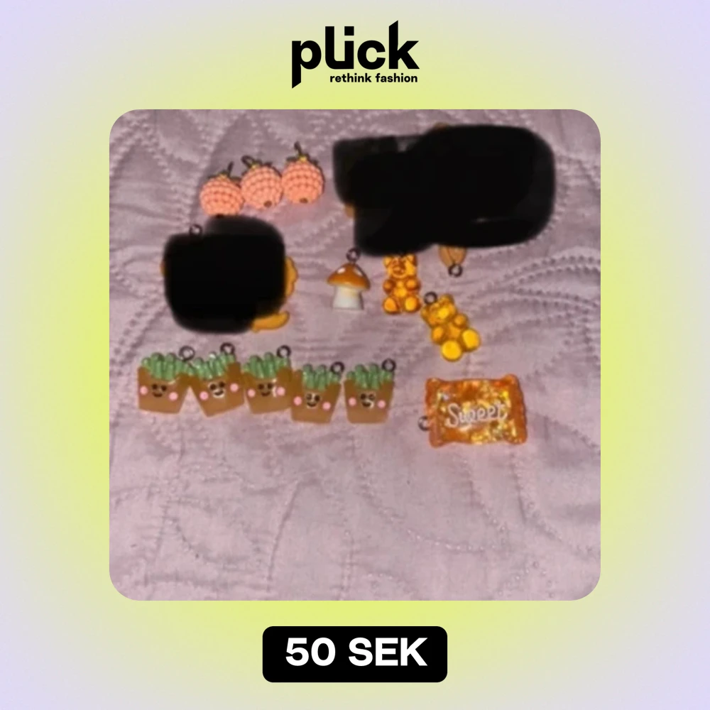 Säljer ett gäng supersöta örhängen och berlocker! Det finns örhängen som ser ut som persikor i en härlig orange färg. Berlockerna inkluderar en svamp, en björn, små krukor med växter och en godisbit med texten 'Sweet'. Perfekta accessoarer för att ge din outfit en lekfull touch!