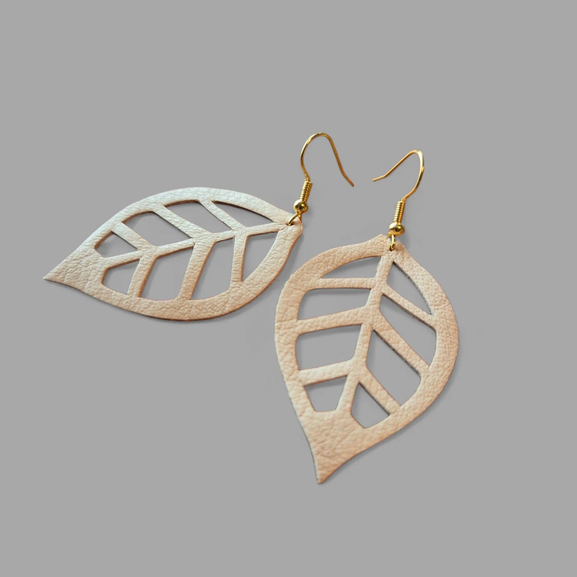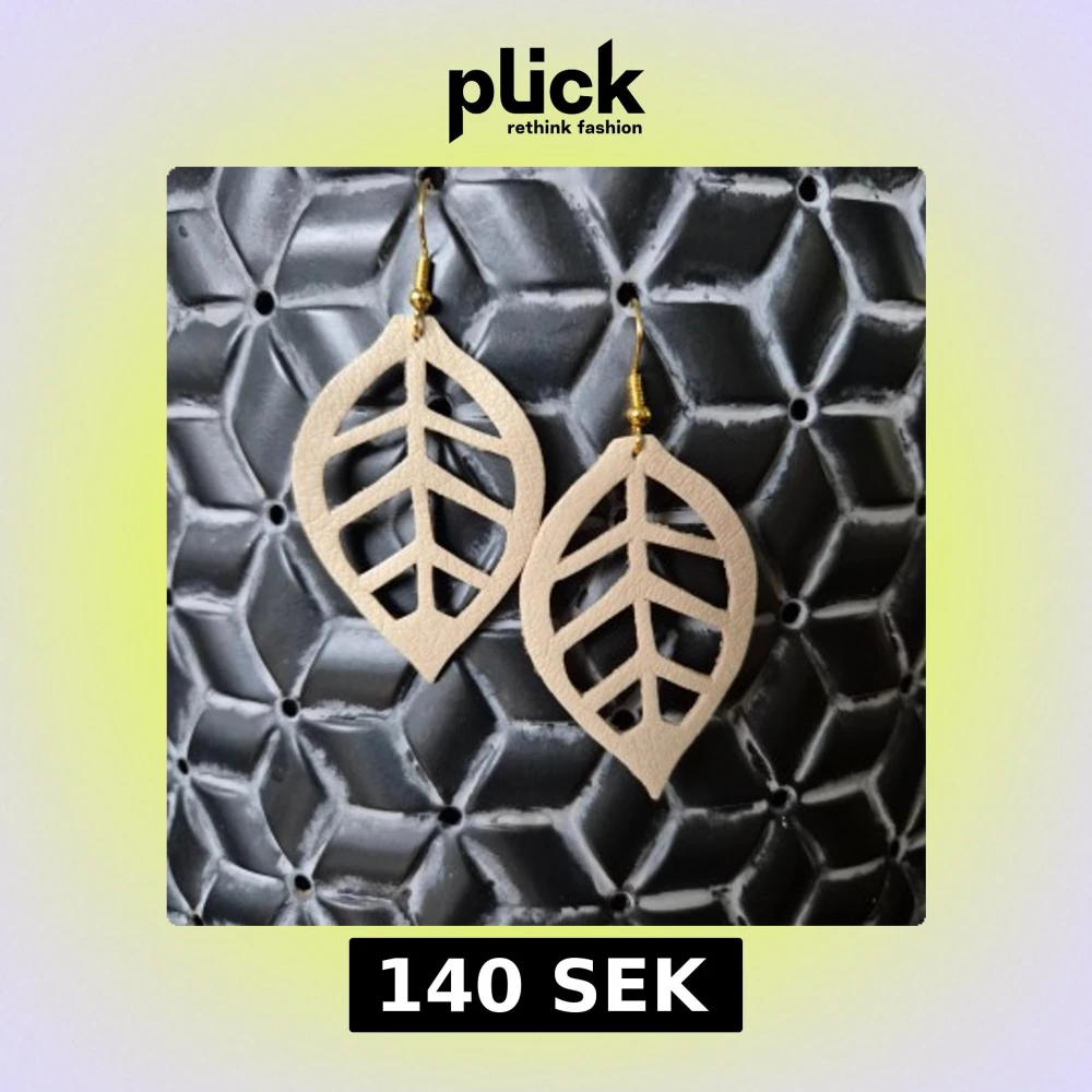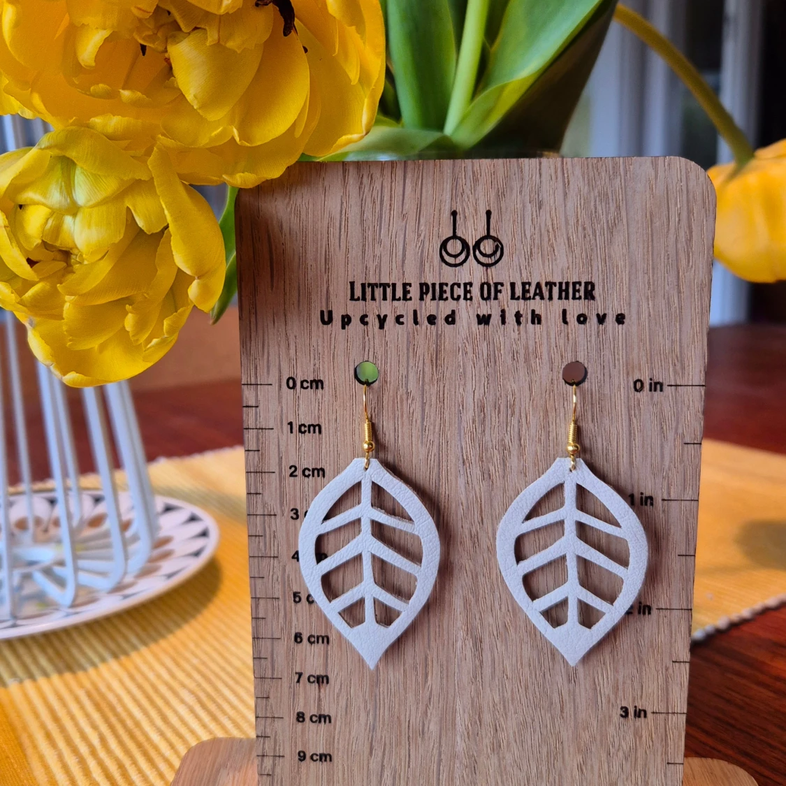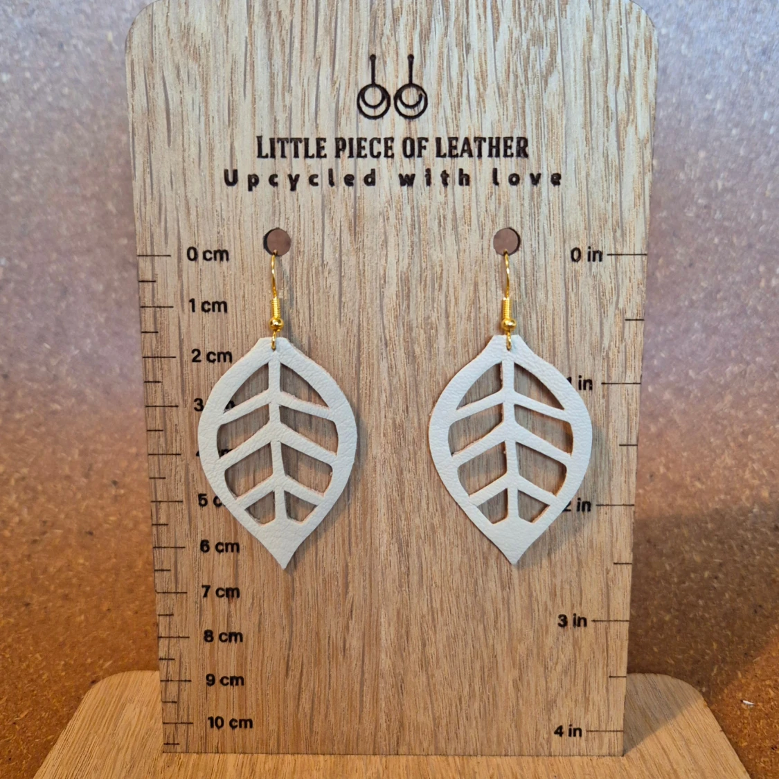 Snygga lövörhängen i naturvitt läder. Återbruk design - skapat av återanvänt läder. Nickelsäkra guldfärgade krokar. Perfekta för dig som vill ha en unik accessoar med naturlig känsla. Handgjorda och lätta att bära. Längd ca 7 cm
