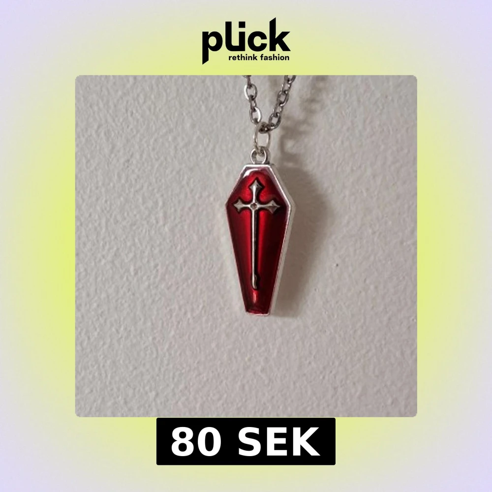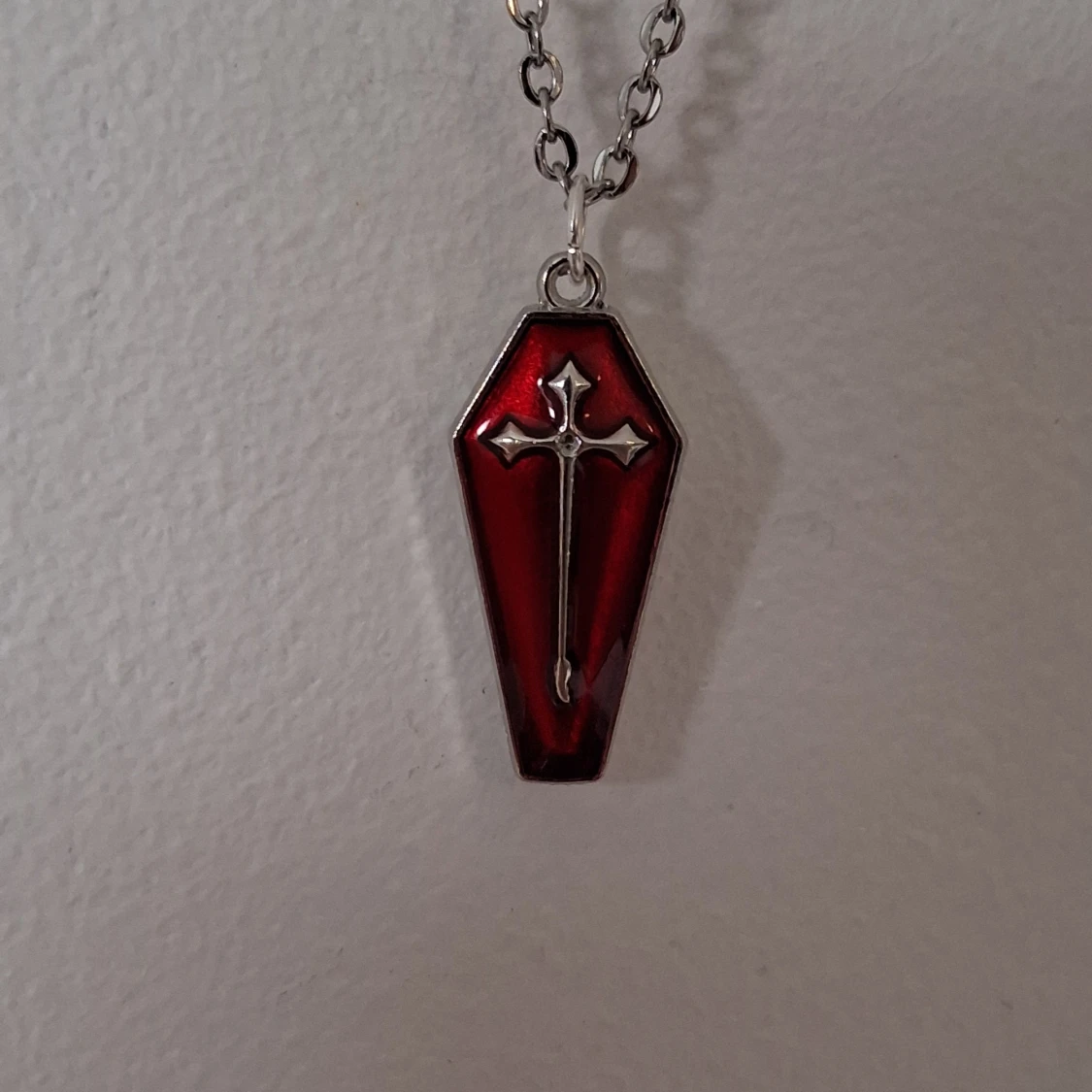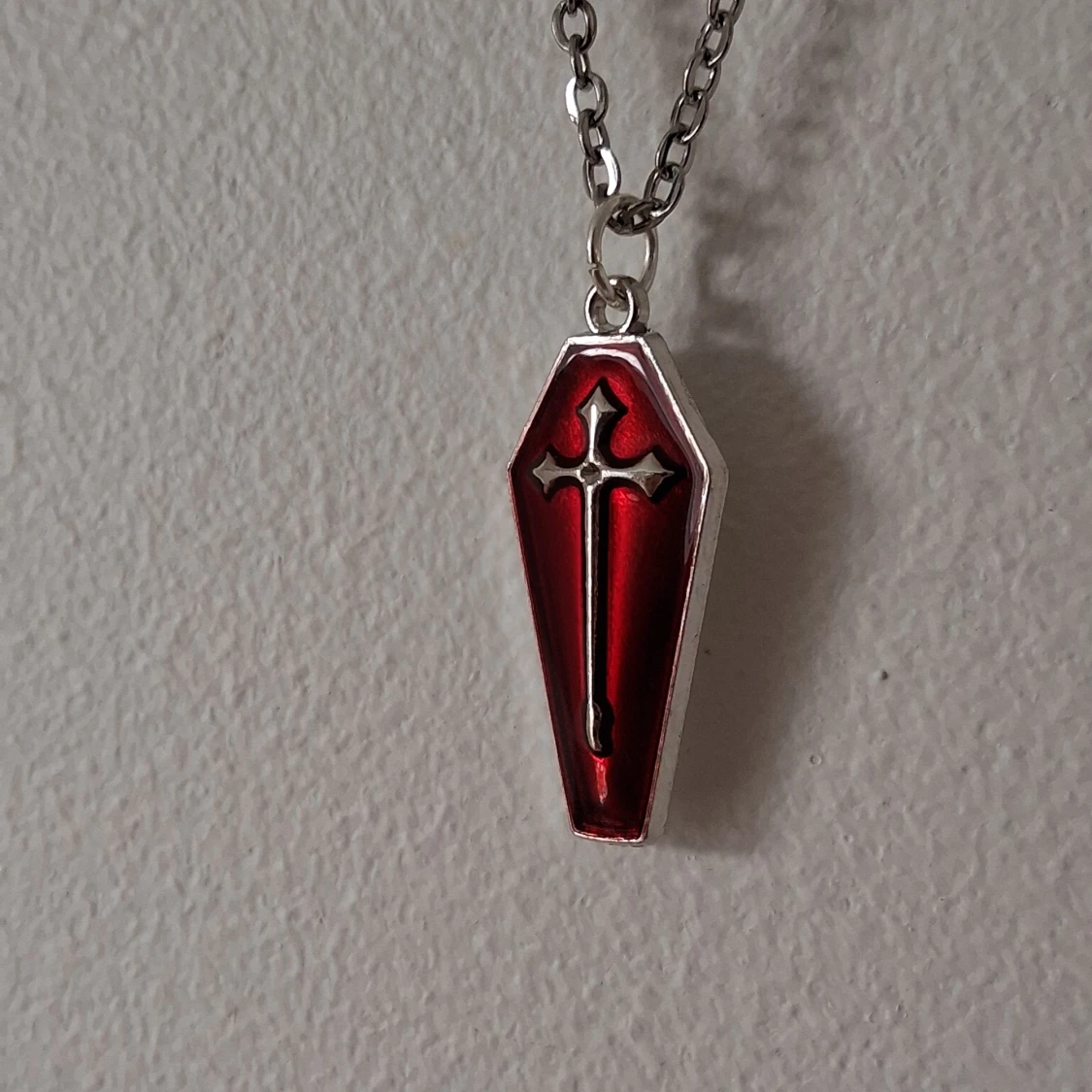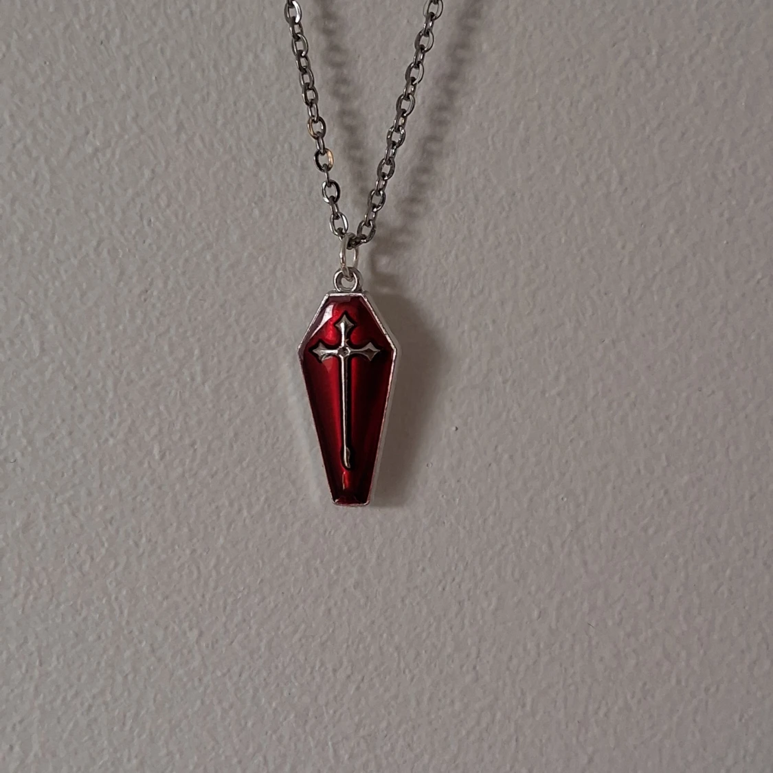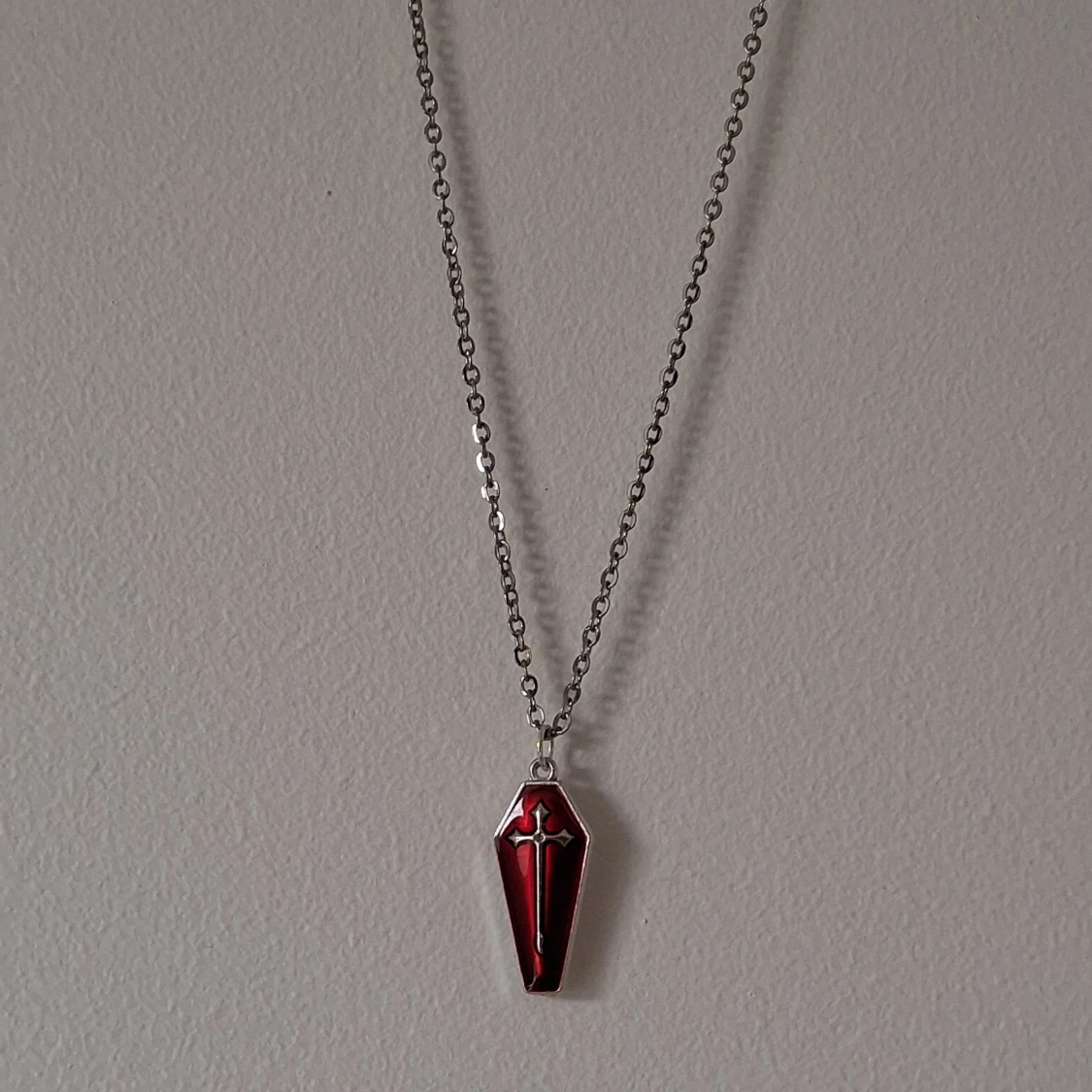 Unikt halsband med en röd kistformad berlock och ett silverfärgat kors i mitten. Kedjan är i silverfärg och berlocken har en blank yta som ger en cool kontrast. Perfekt för att ge din outfit en edgy touch.