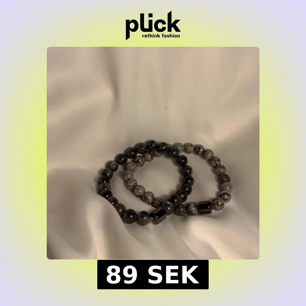 Två elastiska armband med runda pärlor i grått och svart marmormönster. Varje armband har en större, mörk pärla som accent. Perfekt accessoar för en stilren och cool look.