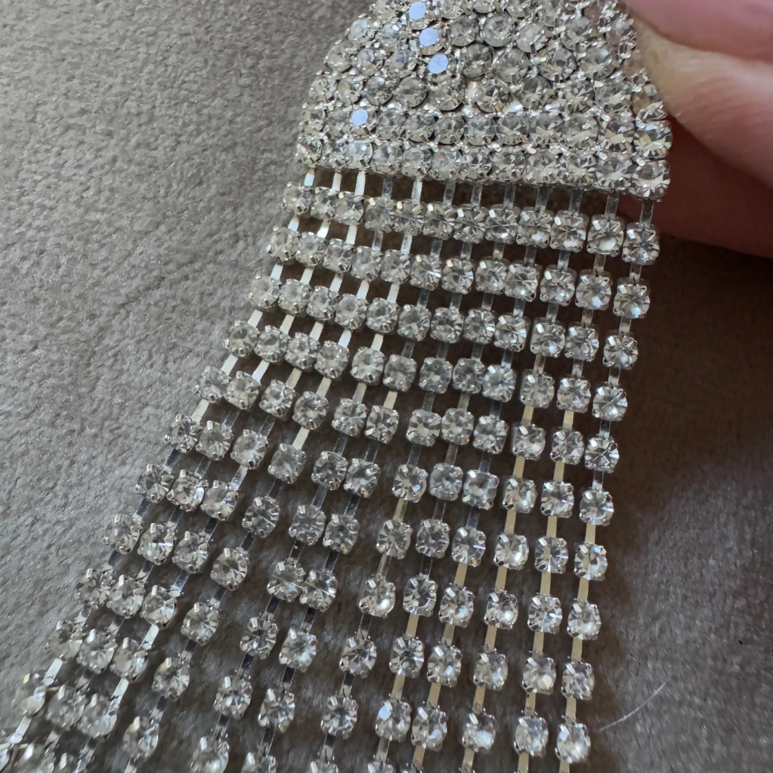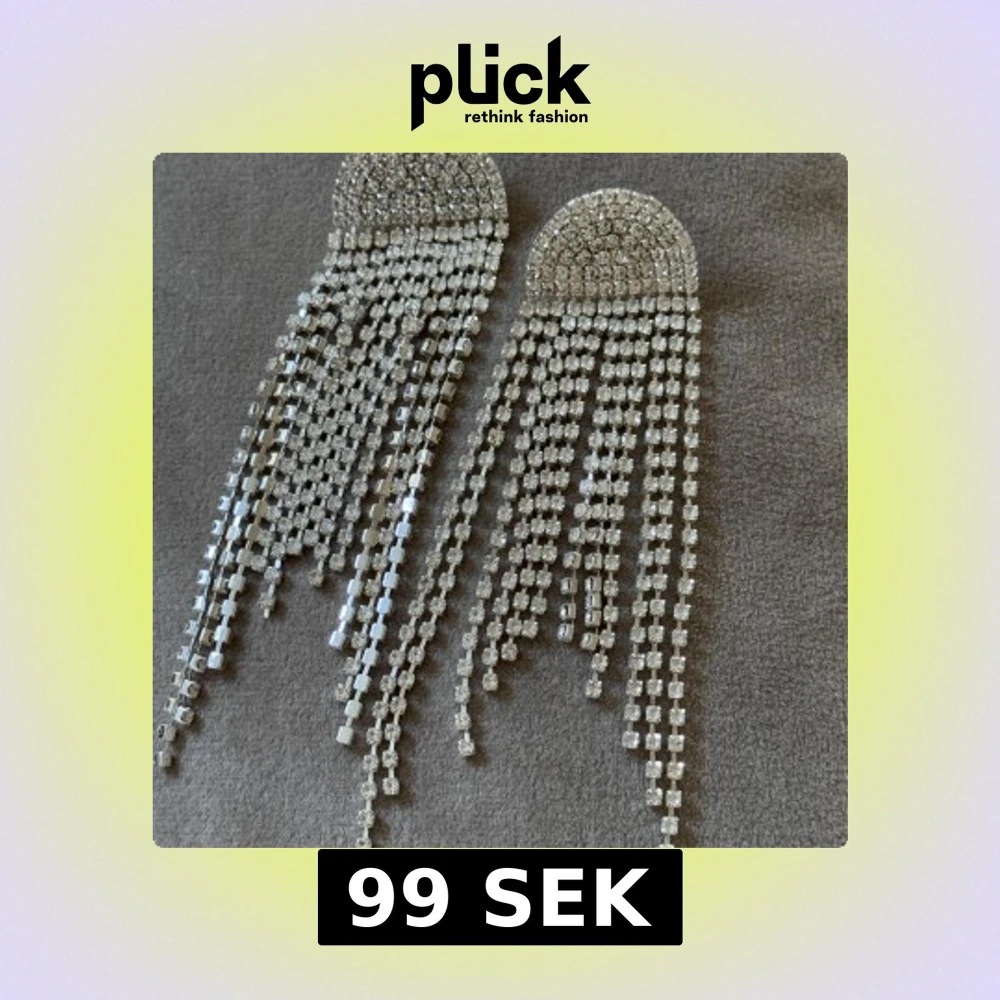 Säljer ett par statement örhängen i silverfärg med massor av gnistrande strass. De har en halvcirkelformad topp och långa hängande kedjor som ger en riktigt glam känsla. Perfekta för dig som vill sticka ut och glänsa extra mycket.