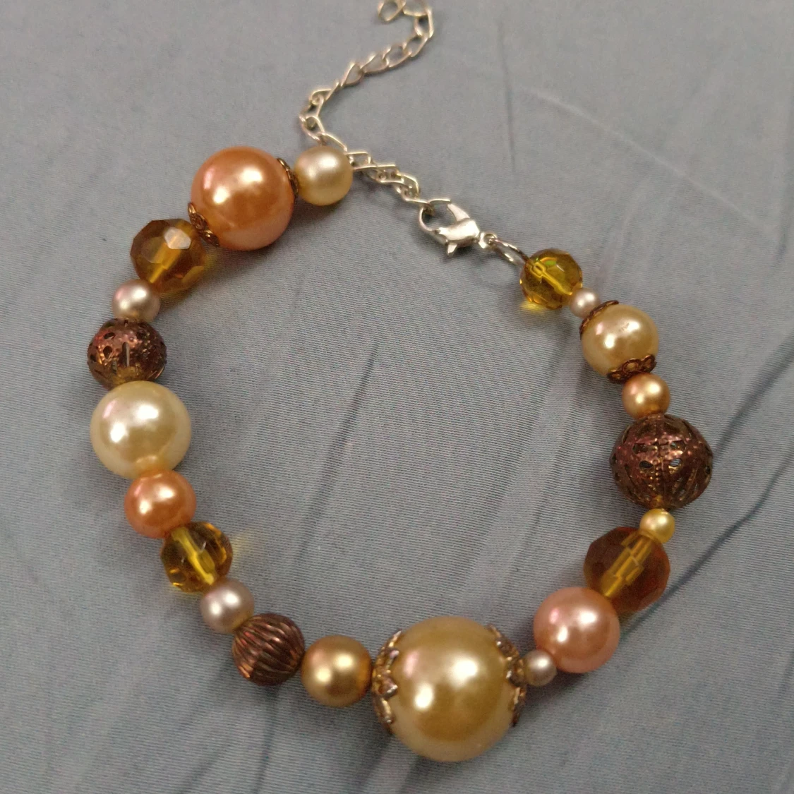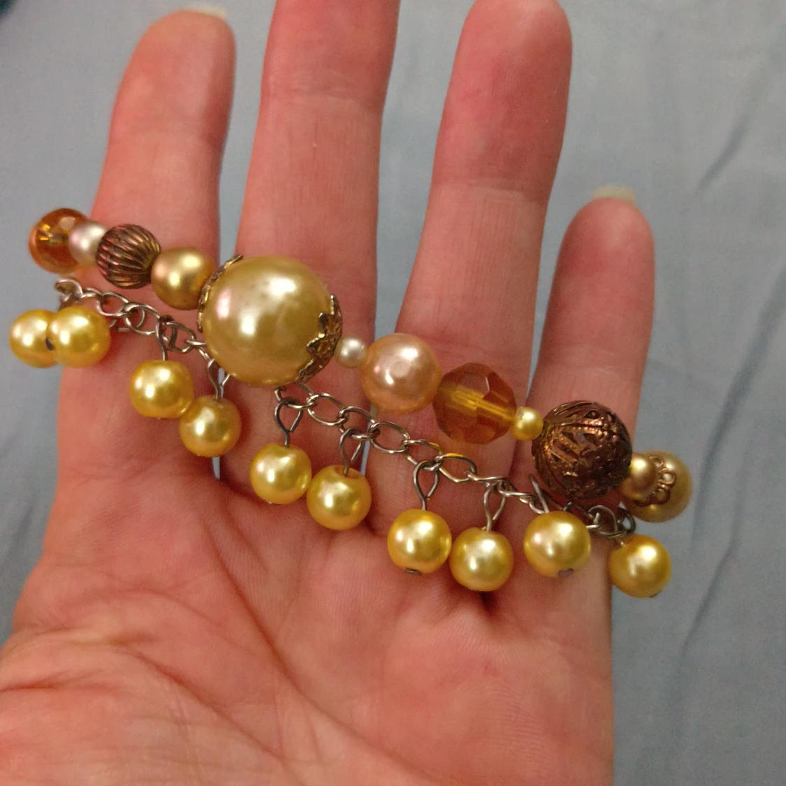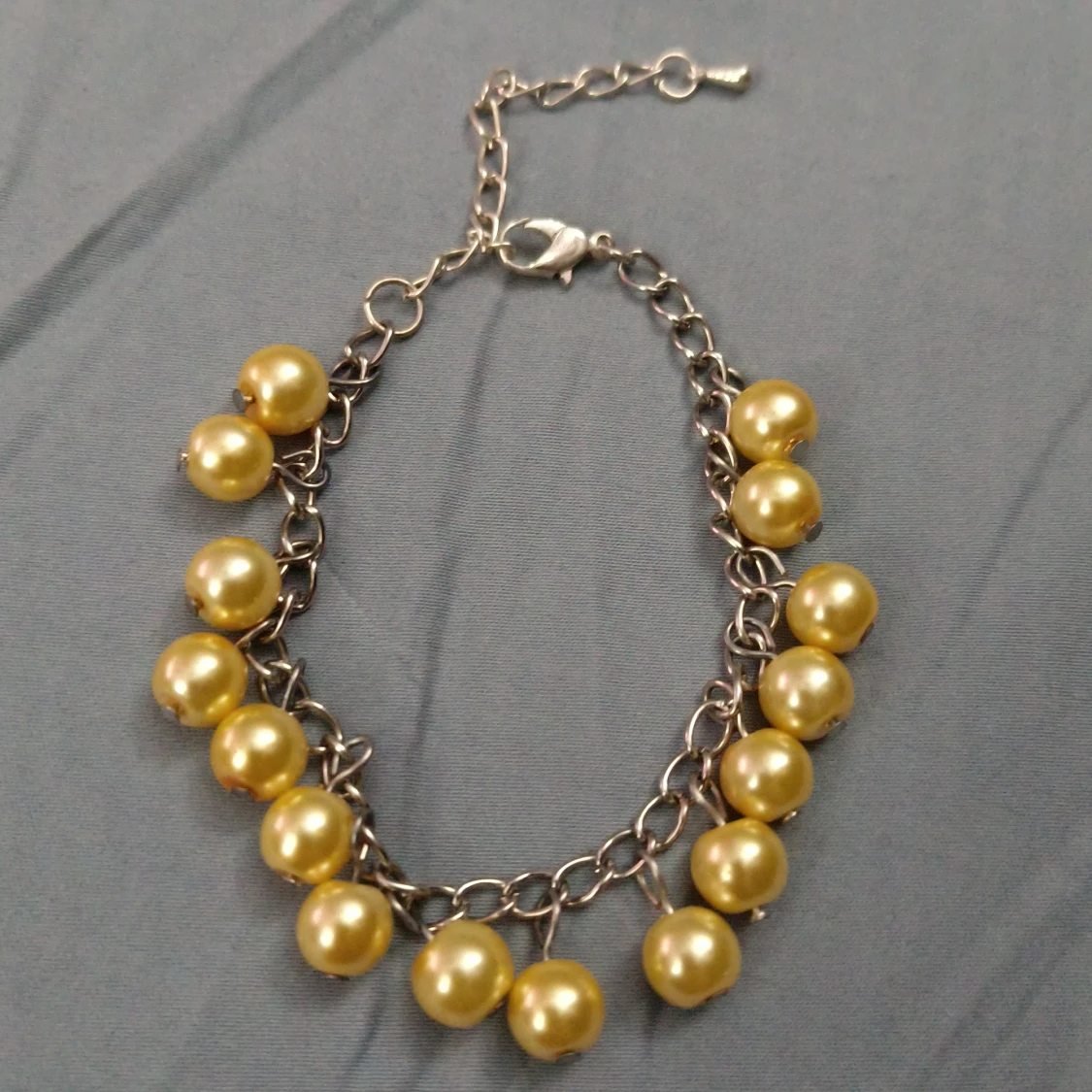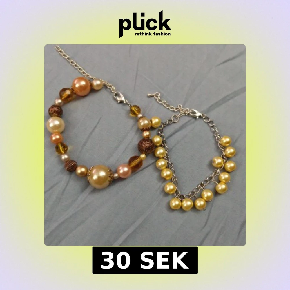 Säljer två snygga armband med pärlor i olika storlekar och färger. Ett armband har mixade pärlor i guld, brunt och champagne på en silverkedja, medan det andra har guldfärgade pärlor hängande på en länkad kedja. Perfekt för dig som gillar unika accessoarer! Båda armbanden har förlängningskedja och passar jättebra att bära tillsammans.