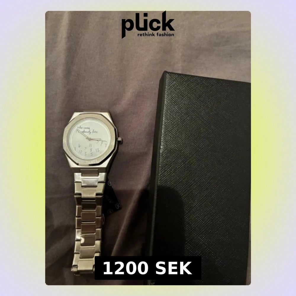Säljer en stilren klocka från Miler i silverfärgat rostfritt stål. Urtavlan har ett unikt och lekfullt tryck med texten 'Who cares I'm already late' och siffrorna är placerade huller om buller. Länken är klassisk och boetten har en kantig form som ger en modern vibe.