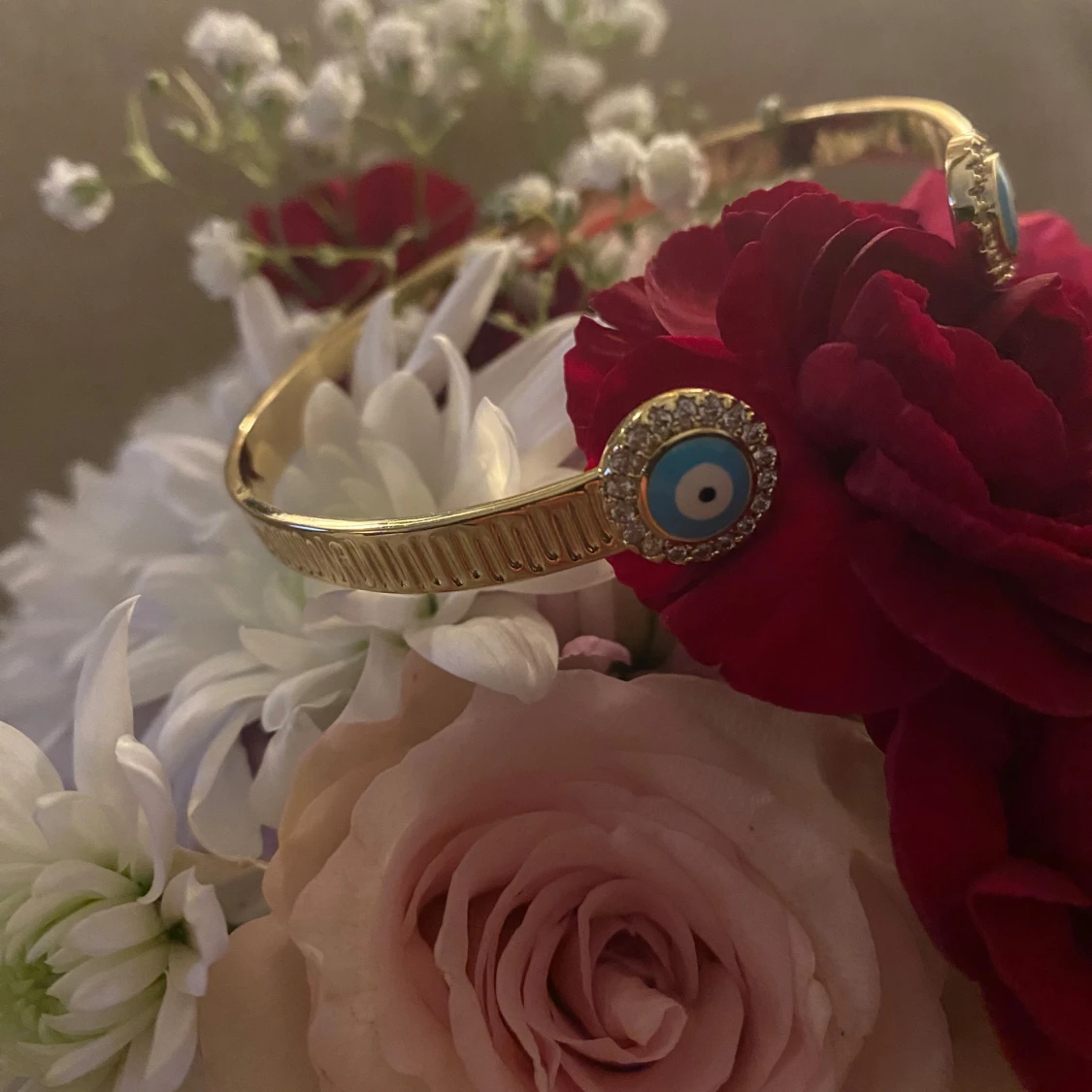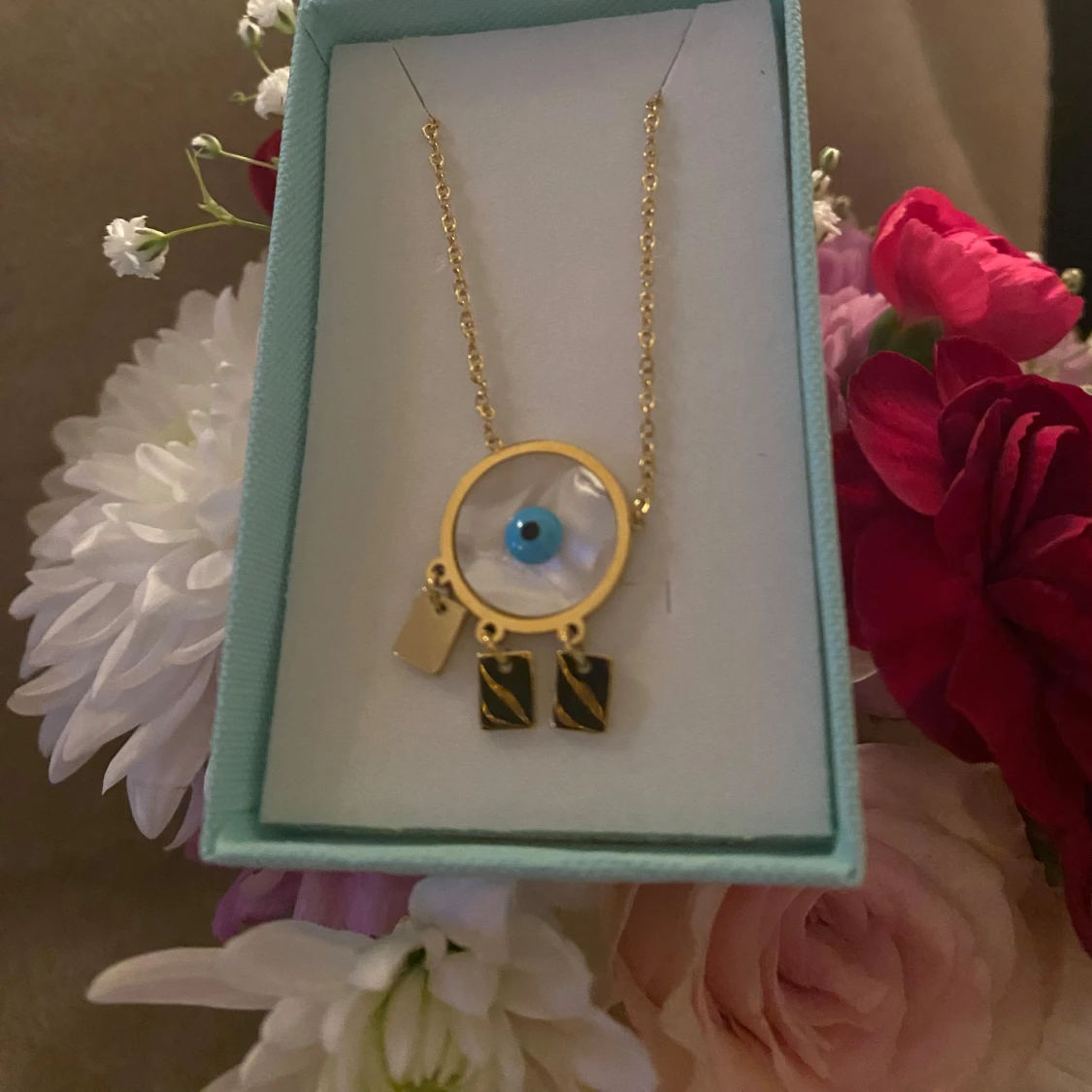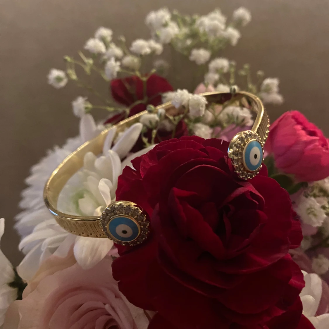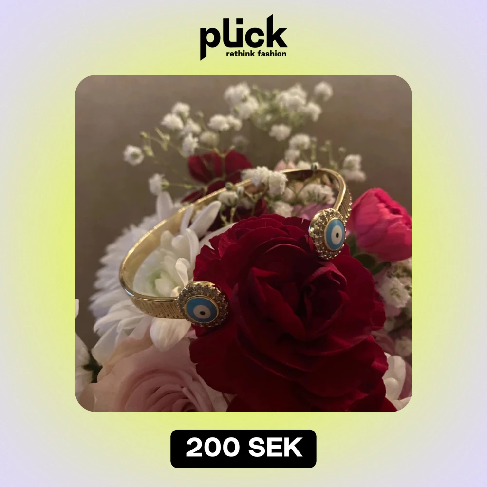 Säljer ett snyggt guldarmband och matchande halsband med ögonmotiv. Armbandet har två blå och vita ögon med glittrande detaljer runtom. Halsbandet har ett hängsmycke med ett liknande öga och små rektangulära hängen. Perfekt för att ge en mystisk touch till din outfit!