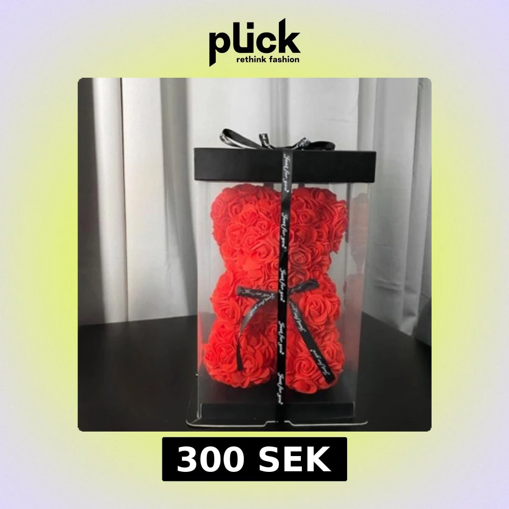 Charmig nalle gjord av röda rosor, perfekt som en romantisk present. Nallen kommer i en elegant genomskinlig presentförpackning med svart band. En unik och vacker dekoration för speciella tillfällen.