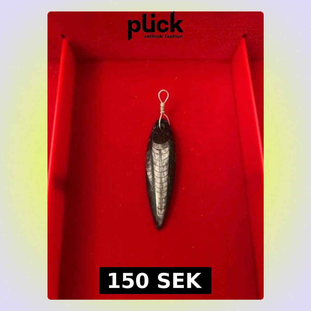Unikt halsband med en spetsig fossilberlock i svart och grått. Berlocken har ett coolt mönster som liknar en urtida varelse och är fäst med en äkta silver hänge. Perfekt för dig som gillar annorlunda och naturinspirerade smycken.