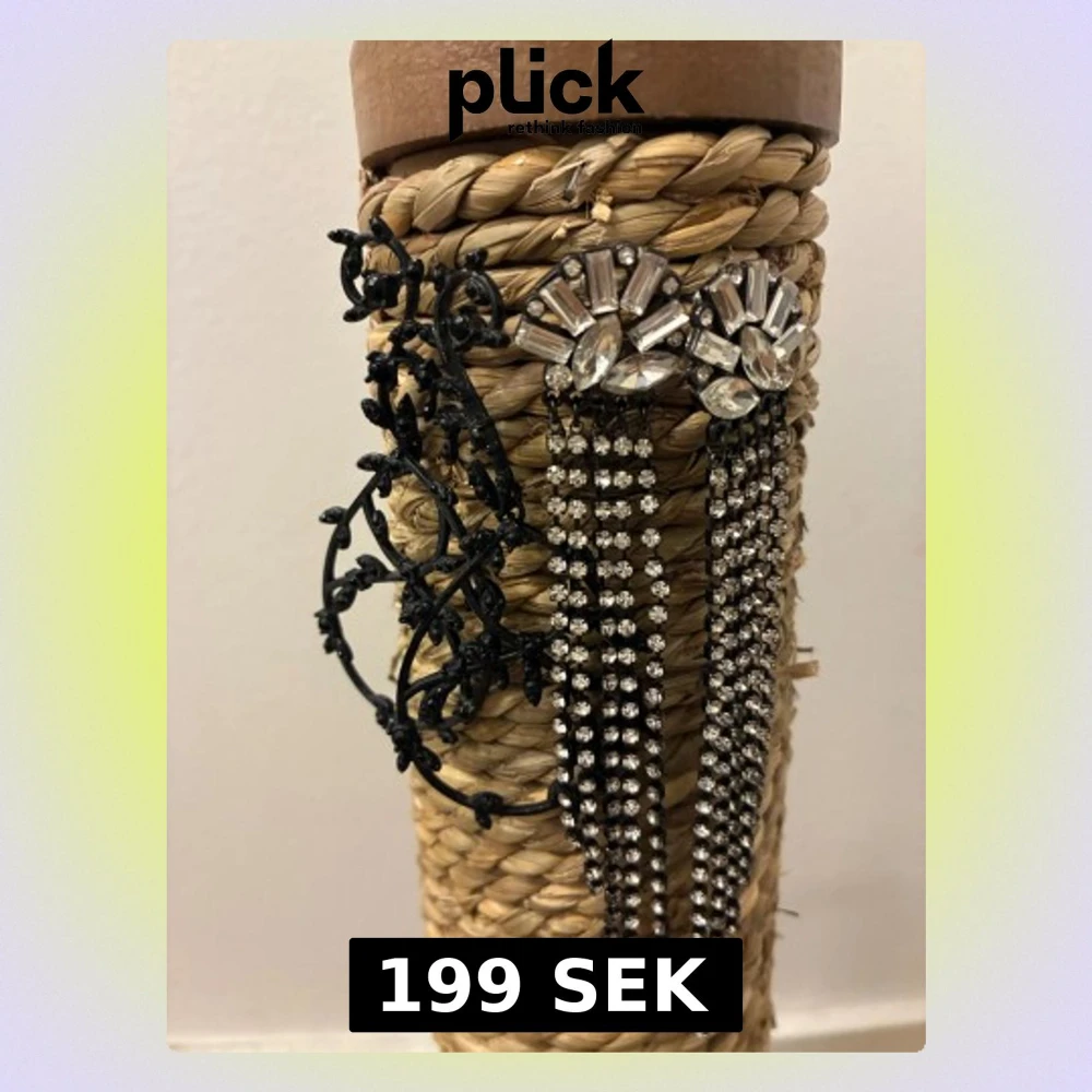 Säljer två par coola örhängen. Ett par är långa, glittriga och silverfärgade med strass och hängande kedjor, perfekta för att sticka ut. Det andra paret är svarta, stora och har en snygg blommig design med detaljerade blad. Paketpris 199kr styckpris 129kr.