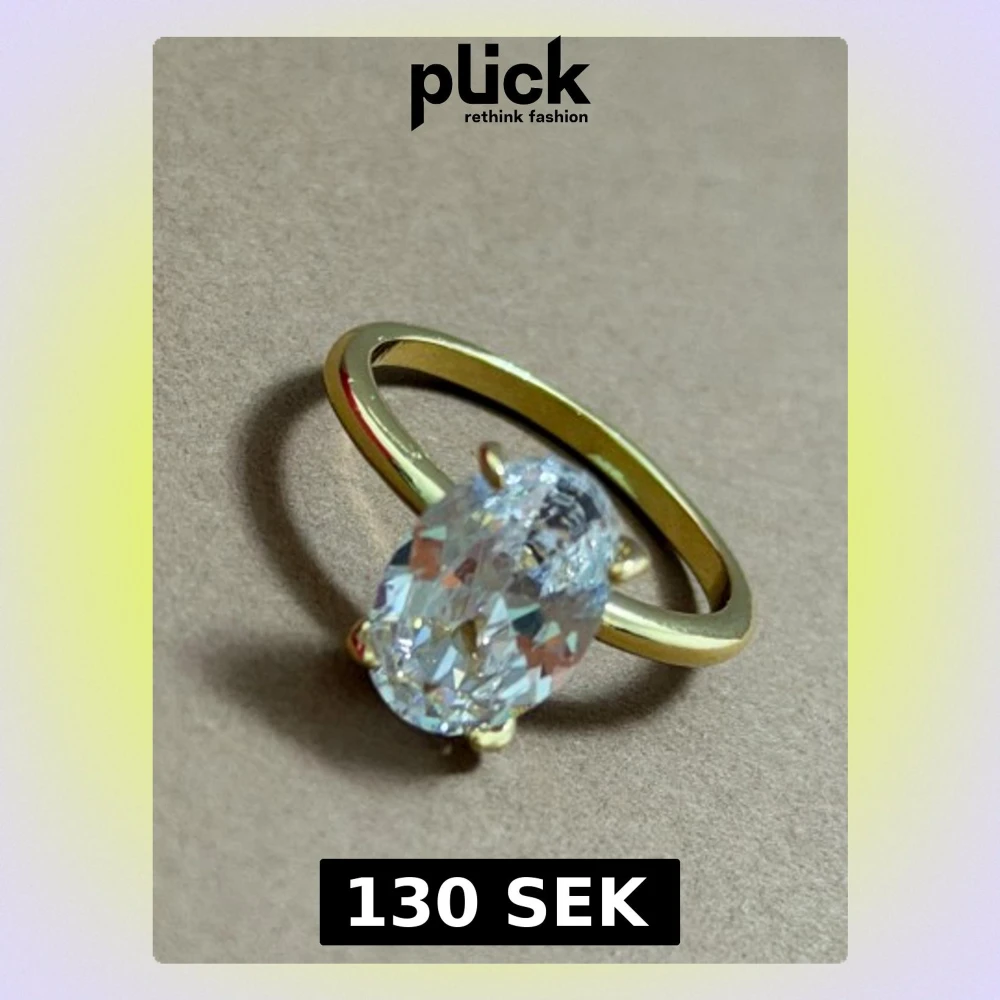 Snygg guldring med en stor, oval slipad klar sten som gnistrar. Ringen har en enkel och stilren design med slät guldfärgad band och fyra klor som håller stenen på plats. Perfekt för dig som gillar statement-smycken och vill sticka ut. 7 i storlek