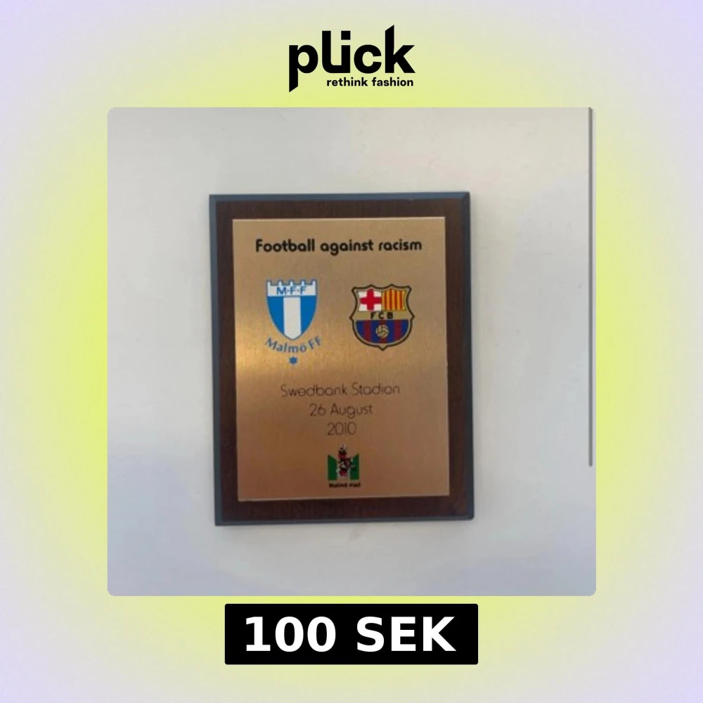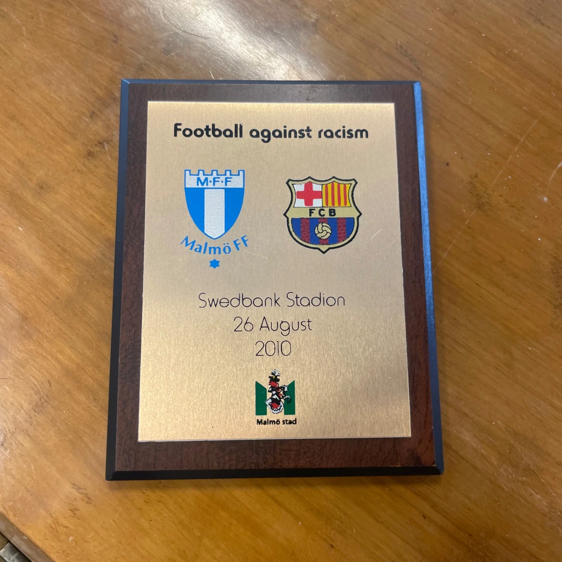Minnesplakett från evenemanget 'Football against racism' mellan Malmö FF och FC Barcelona på Swedbank Stadion, 26 augusti 2010. Perfekt för dig som älskar fotboll och vill ha ett unikt samlarobjekt med starkt budskap mot rasism.