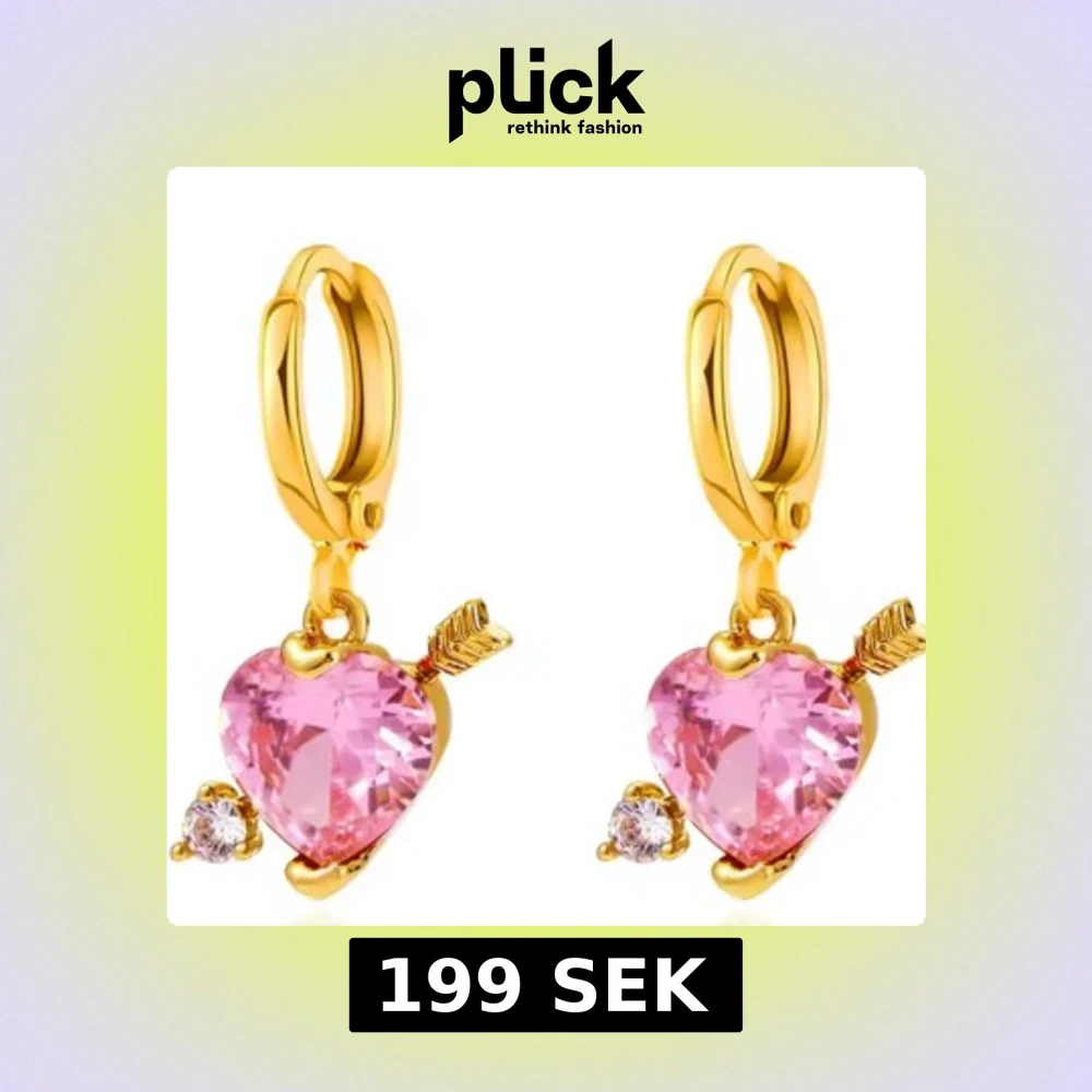 Säljer ett par guldpläterade örhängen med hängande rosa hjärtformade stenar och små vita stenar. Örhängena har en pil-detalj som går genom hjärtat för en romantisk look.