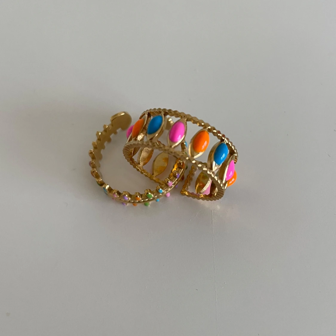 Säljer en snygg guldfärgad ring med färgglada stenar i blått, orange, rosa och gult. Ringen har en öppen design och dekorativa detaljer längs kanterna. Perfekt för dig som vill ha något unikt och lekfullt.