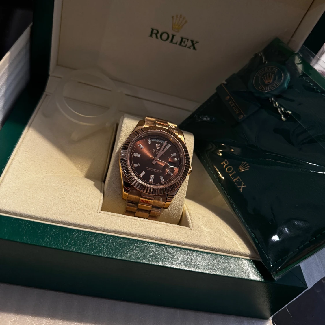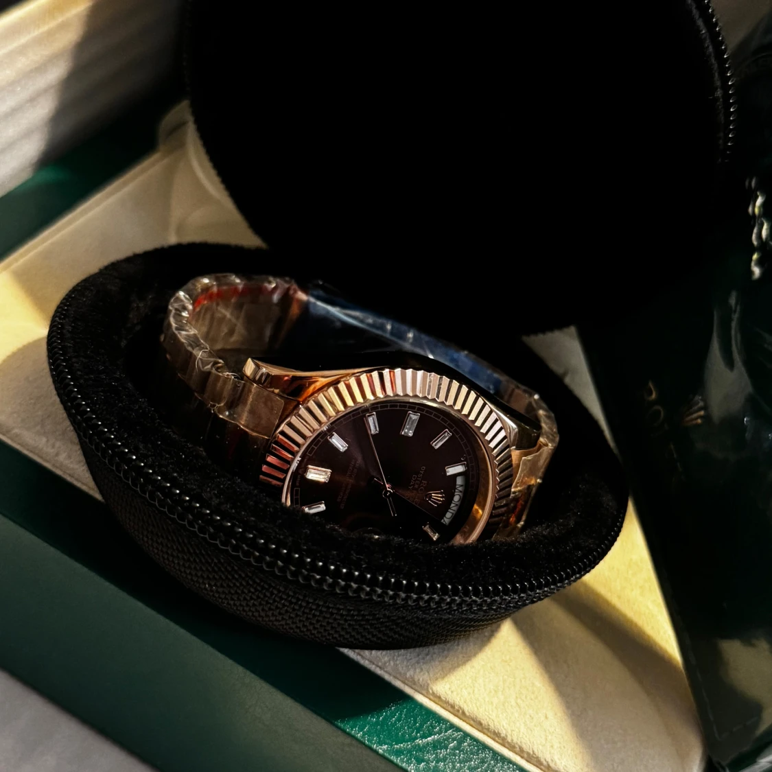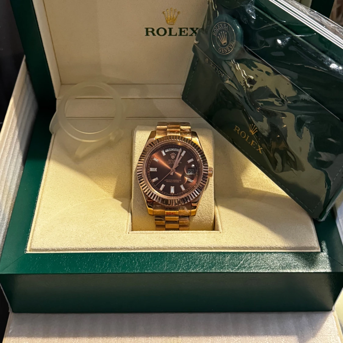 Helt ny herrklocka med mörkbrun urtavla, räfflad bezel, klassisk länkarmband i president Levereras i svarta boxen som finns på bild. Perfekt för dig som vill sticka ut med stil.