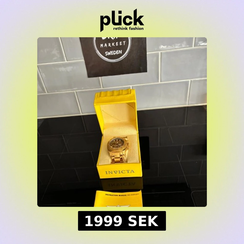 Säljer en snygg och maffig guldig klocka från Invicta med metallarmband och svart urtavla. Klockan har flera små urtavlor och tydliga siffror på ringen. Kommer i original gul box med manual. Perfekt för dig som gillar statement-accessoarer.