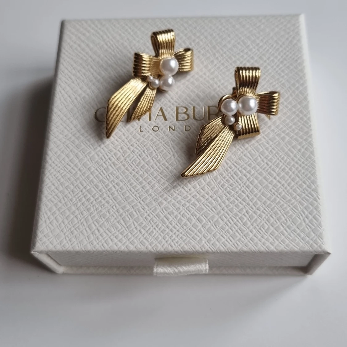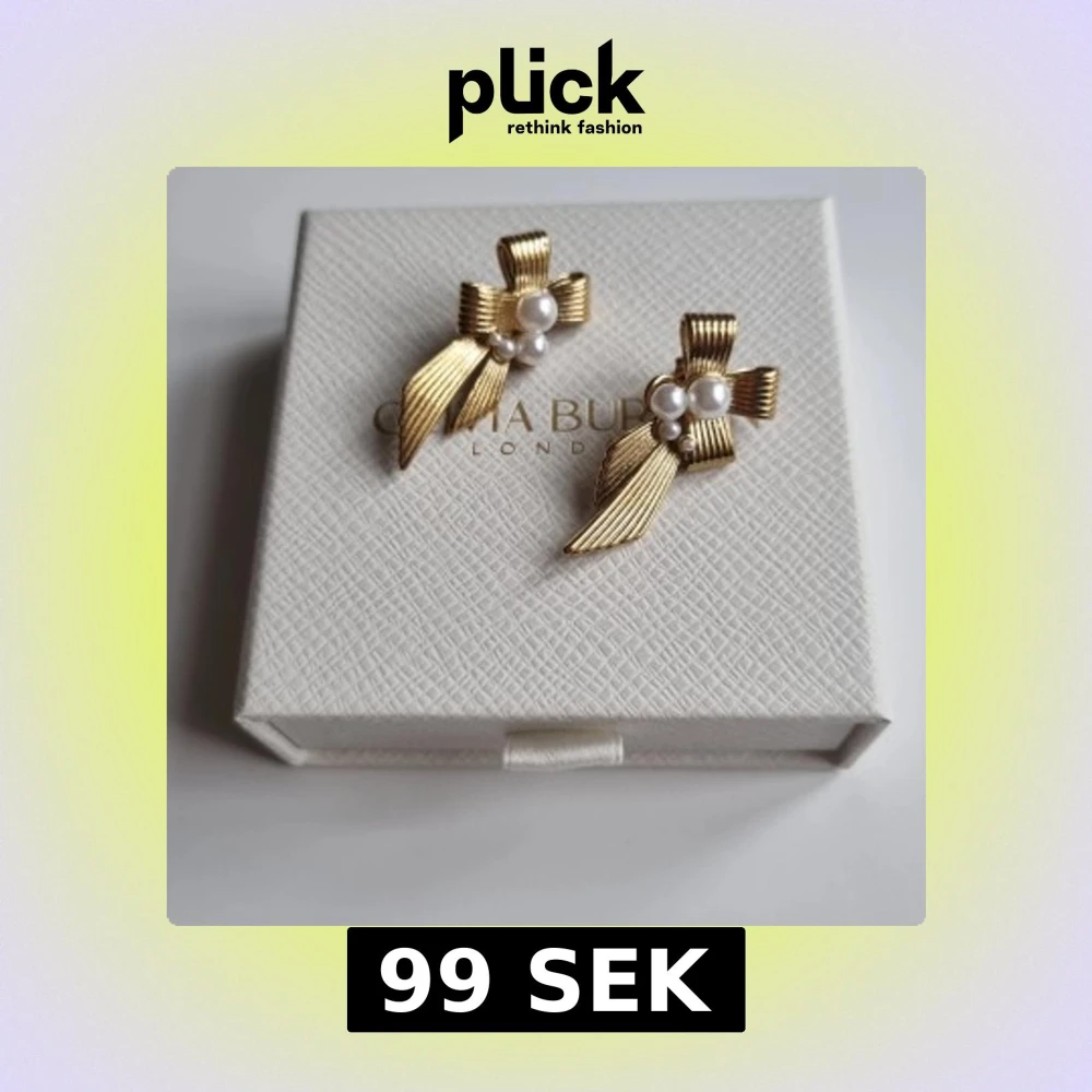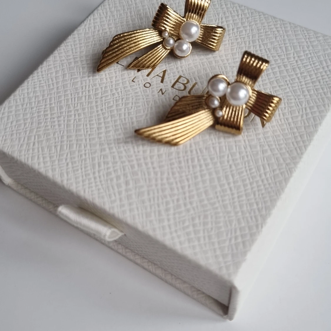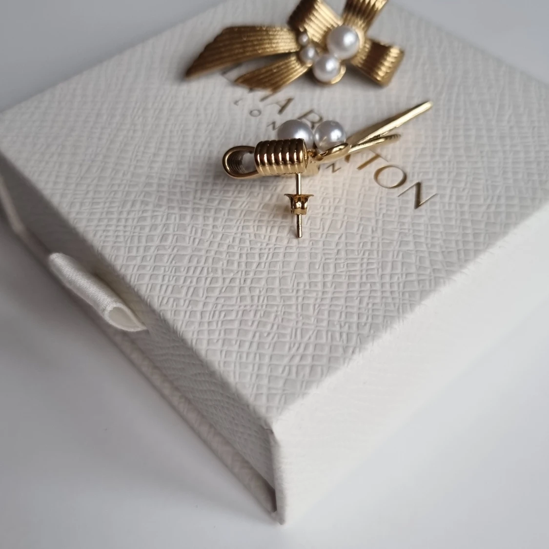 Säljer ett par snygga örhängen i guldtonad metall med rosettformad design och vita pärlor som detalj. De har en cool struktur och fästs med klassisk stift. Perfekt för dig som gillar statement-smycken med lyxig vibe. Lådan ingår ej.