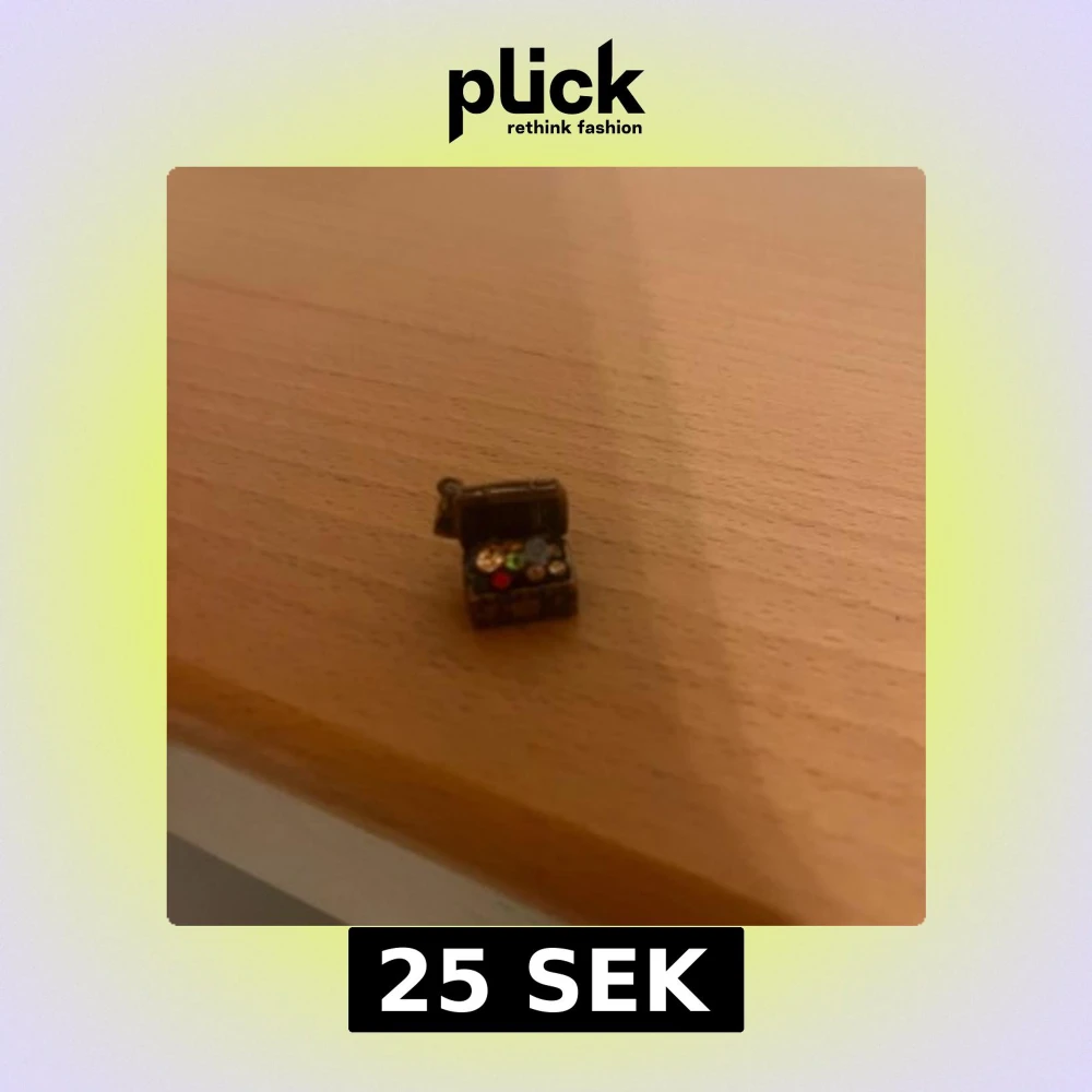 En liten och detaljerad berlock i form av ett skattskrin, dekorerad med färgglada stenar. Perfekt för att ge ditt armband en unik och lekfull touch.