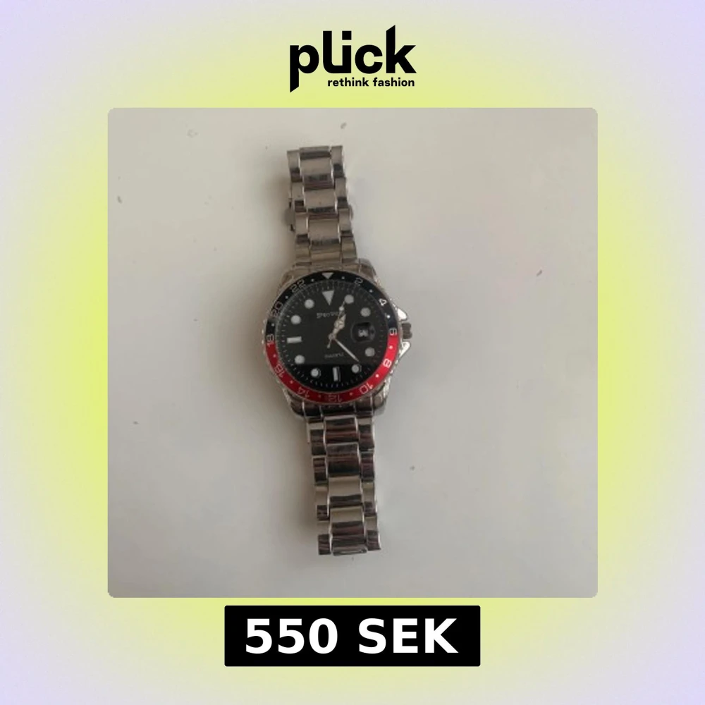 Stilren klocka från Spectrum med silverfärgad länk i metall, svart urtavla och en bezel i rött och svart. Urtavlan har tydliga index och datumfönster med förstoringsglas. Klassisk design som sticker ut med sin färgade ring och robusta känsla.