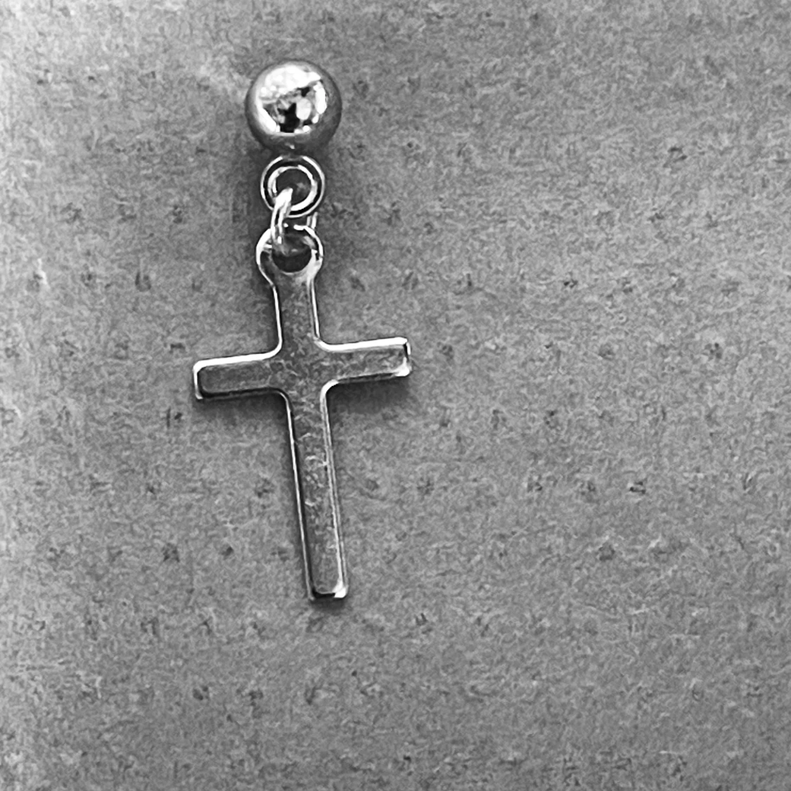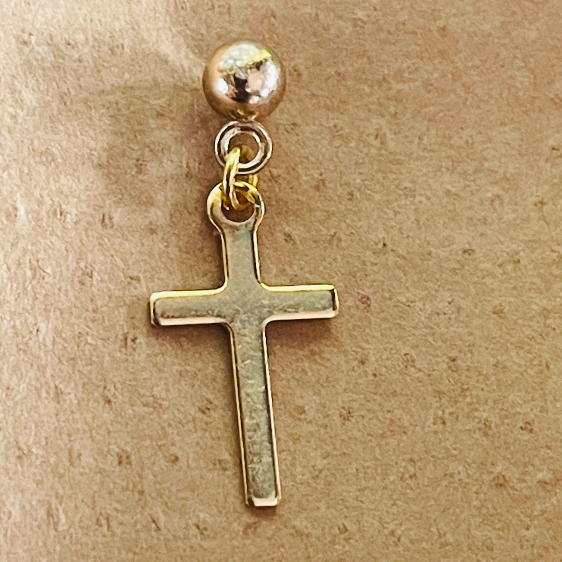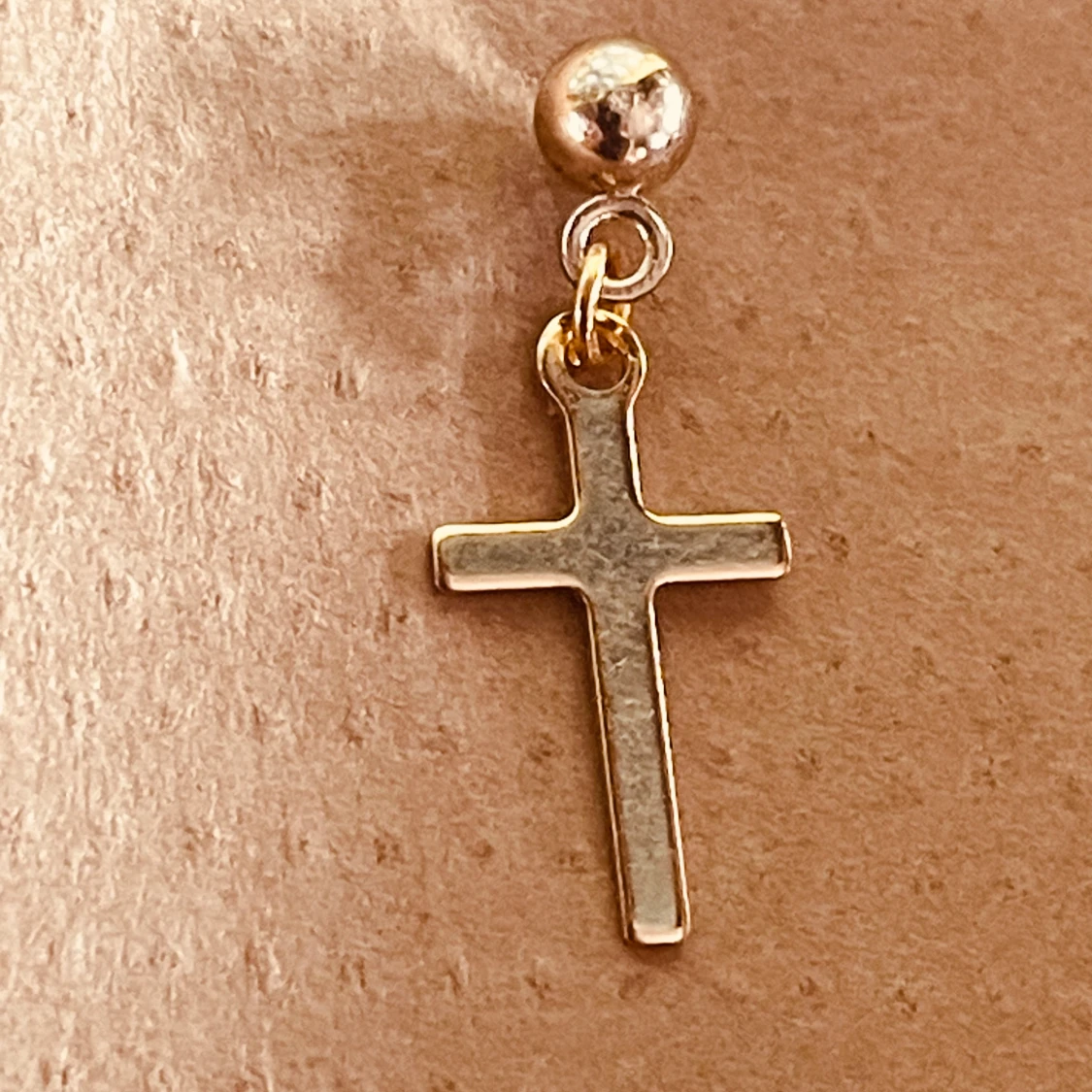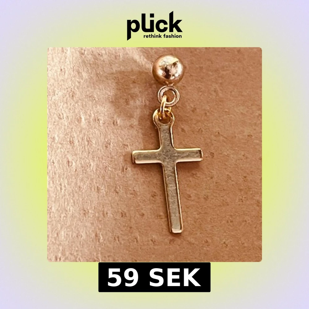 Snyggt örhänge med ett stilrent kors i guldton, hängande från en rund kula. Korset har en enkel och modern design som passar dig som gillar minimalistiska smycken med lite edge. Perfekt att matcha med andra örhängen eller bära solo för en clean look.