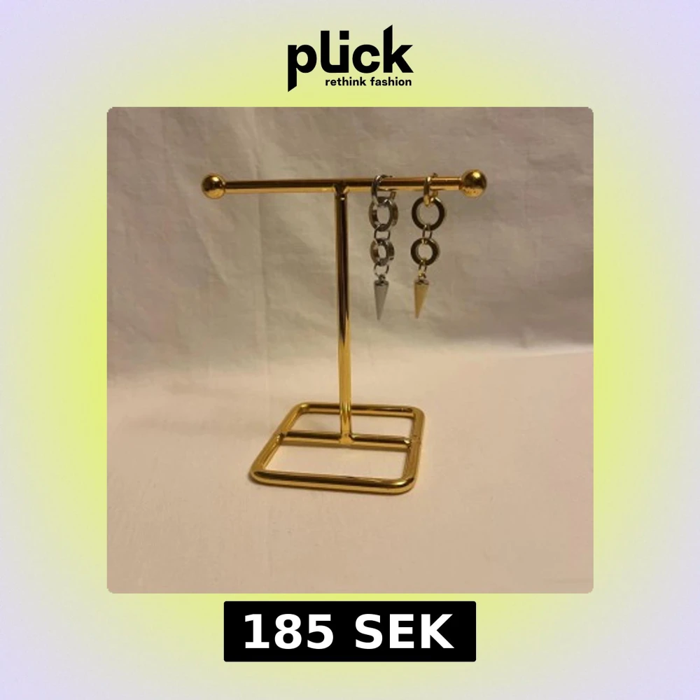 Säljer ett par coola chunky örhängen i silver och guld med stora ringar och konformade hängen. De har en edgy vibe och passar perfekt om du gillar statement-smycken. Materialet är metall och designen är modern med kontrasterande färger.