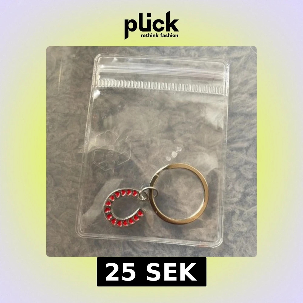 Cool nyckelring med en hästskoformad berlock i silverfärg. Ena sidan är dekorerad med små röda hjärtan, andra sidan är glittrig och silvrig. Perfekt accessoar för dig som gillar hästar eller vill ha lite extra tur i vardagen.