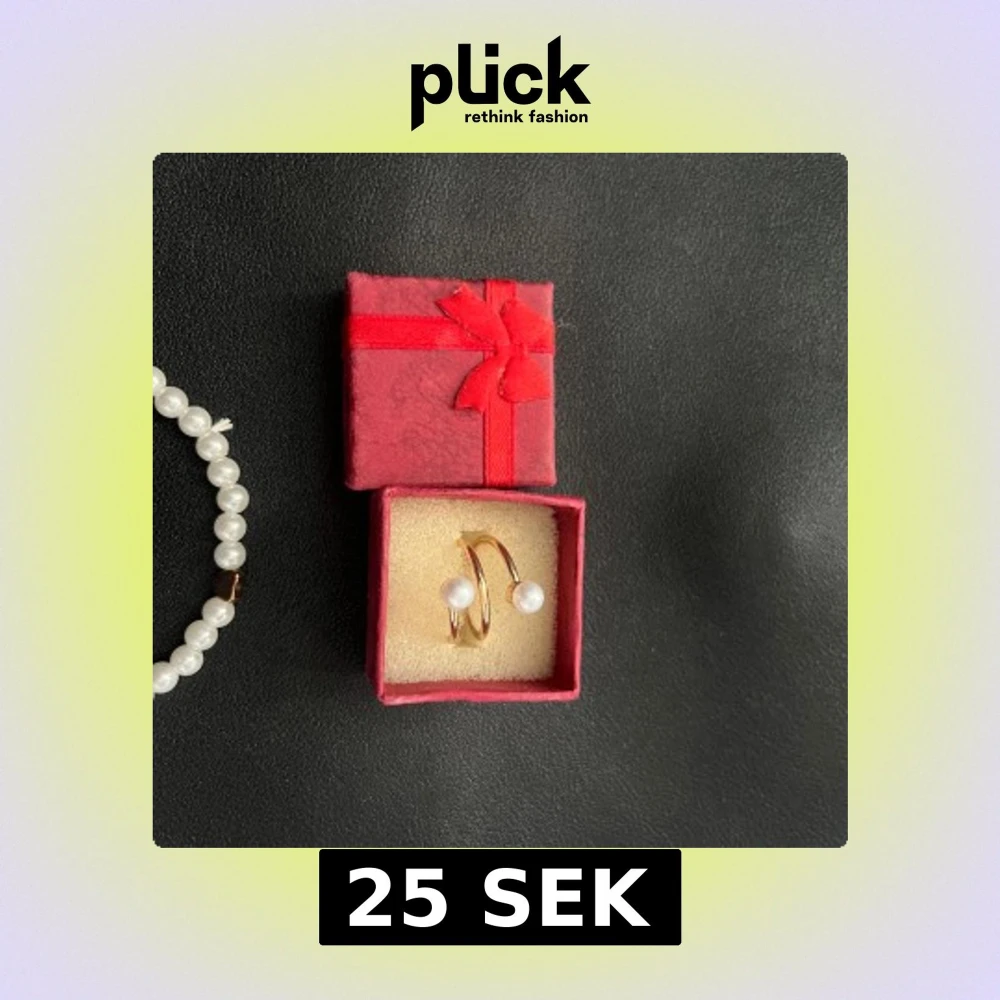 Säljer ett snyggt armband med vita pärlor och en guldig ring med två pärlor. Ringen har en öppen design och armbandet är elastiskt med en liten guldig detalj. Perfekt för dig som gillar klassiska smycken med en modern twist.