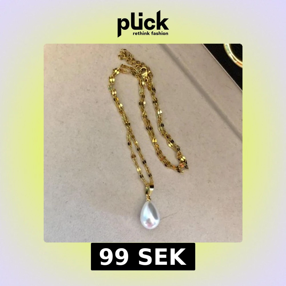Elegant och lyxigt halsband med ett vackert pärlhänge som är format som en droppe . Kedjan är gjord av stainless steel med 18 karat guld utanpå. Använt några gånger men stort sett nyskick. Lite större modell på hänget väldigt snygg till både vardag och fest